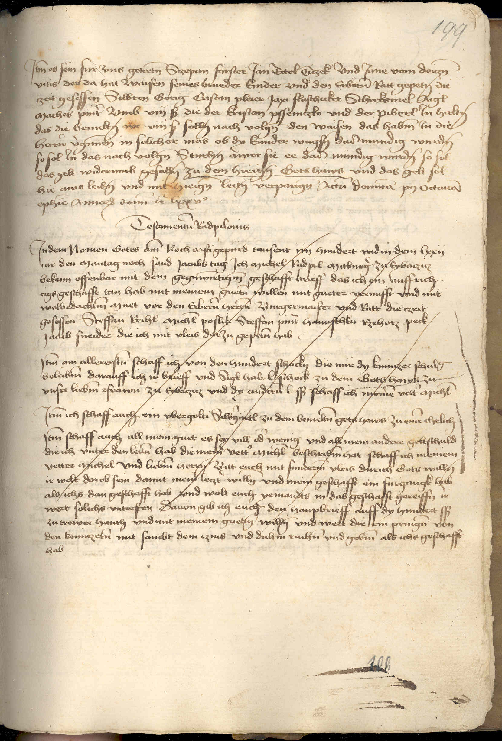 Vnd liebem herren bitt euch mit sunderem vleis durich gots willen ir welt dorob sein, damit mein leczter willen vnd mein geschafft ein furgangk hab, als ichs dan geschafft hab, vnd wolt euch yemandts in das geschafft gereiffen ir wert solichs vntersten. Dauon gib ich euch den haupbrieff auff dy hundert s. zu trewer hanth vnd mit meinem gueten willen vnd wert die ein pringen von den Kuniczeren mit sambt dem czins, vnd dahin raihen vnd gebem, als ichs geschafft hab.4)