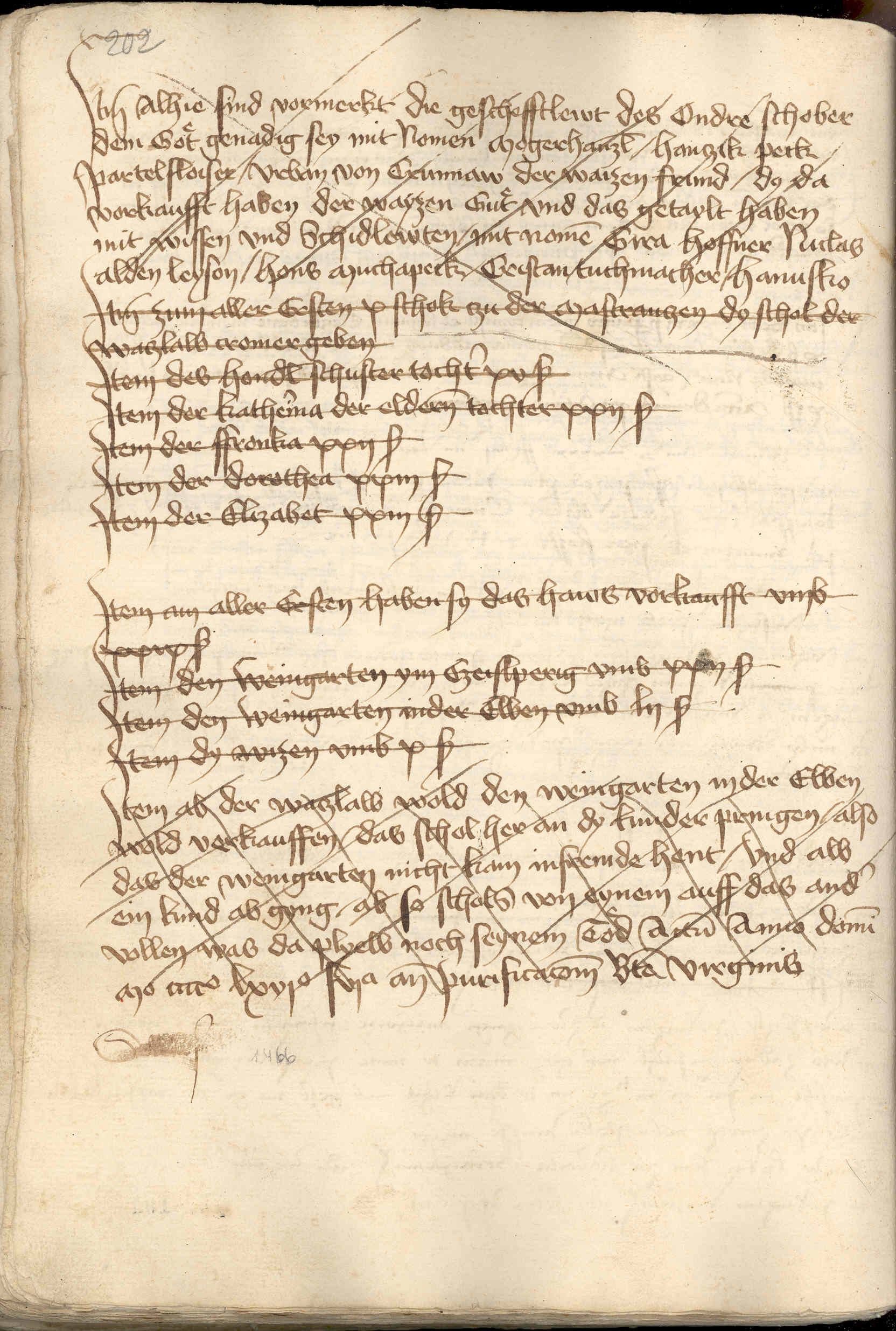 Item ab der Waczlaw wold den weingarten in der Ewen wold verkauffen, / das schol her an dy kinder pringen, / also das der weingarten nicht kam in fremde hent. / Vnd als ein kind abgyng, / ab so schols2) von eynem auff das anderen vollen, was da plyew nach seynem toed, actum anno Domini Mo CCCCo lxvjo feria via ante Purificacionem beate virginis.3)
