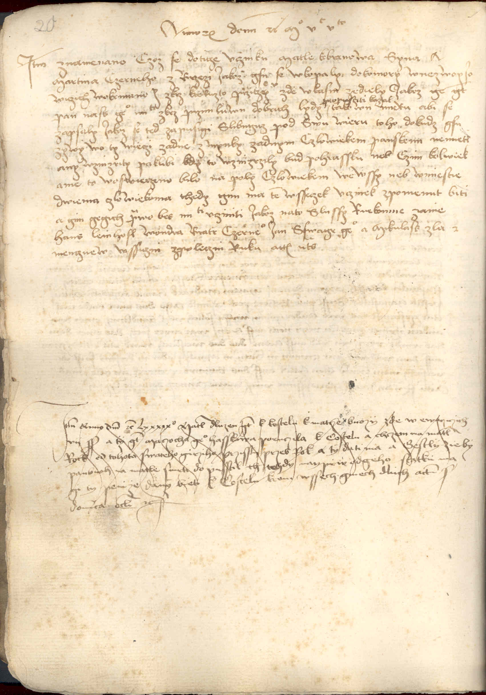 Item znamenano, czoz se doticze uczniku Matle Kebranewa syna a Martina Czerneho z Brzezi. Jakoz jsu se wkopaly do komory w Nezwoyiowiczich [Neslovice] […?] a zkrz kterezto prziczineni zde w kasni zediely, jakoz ge gest pan nass Jeho Milost zkrz przimluwu dobrich lydy propustiti kazal takowu mieru, aby se zapsaly, jakoz se ted zapisugi, slibugicz pod swu wieru toho, dokudz gsu zywy, wo ty wieczi zadne zmynky zadnym czlowiekem panskeim nemieti any [wznizriti?], paklibi kdy to […?], bud pohrassku neb czimkolwiek […?] to woswieczeno bilo na poly czlowiekem, we wssy nebo wmiestie dwiema czlowiekoma, thedy gim ma ten wsseczek vczinek zpomenut biti a gim gegich prawo bes milosti1) vcziniti, jakoz na to slussy. Ruekomne zanie Hans Leinhosl, Wondra bratr Czerneho, Ian sswagr jeho a Mikulas z [Lamenczuew?], wssiczni zpoleczni ruku2), actum ut supra.