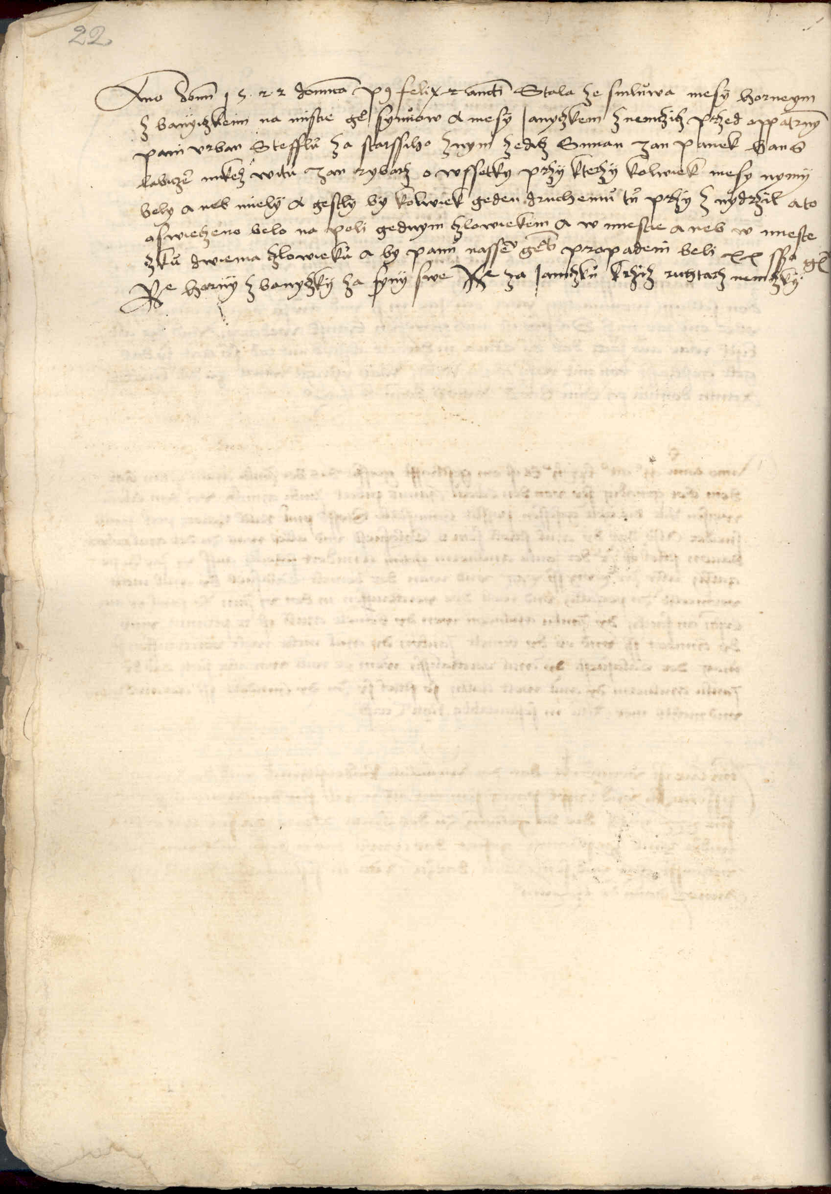 Anno Domini 1522 dominica post Felix et Adaucti stala ze smluwa mesy horneym Zbanyczkeim na mistie geho synuow a mesy Ianyczkem z Nemczicz przed oppatrnymi pani Vrban Stefflů za starssiho, znym zedicz Siman, Ian Panek, Hans Labiczer, Mikez Witu, Ian rybarz, o wssetky przy, kterzy kolwiek mesy nymy bely a neb miely. A gestly by kolwiek geden druchemu tu przy z nydrzil, a to oswieczeno belo na poli gednym czlowiekem a w miestie a neb w miestieczku dwiema czlowieku, a by panu nassemu jeho milosti propadeni beli XX sex. g. R [rukojmí?] horny Zbanyczky za syny swe. R [rukojmí?] za Ianiczku Krziz, richtarz Nemcz[ic]ky.1)