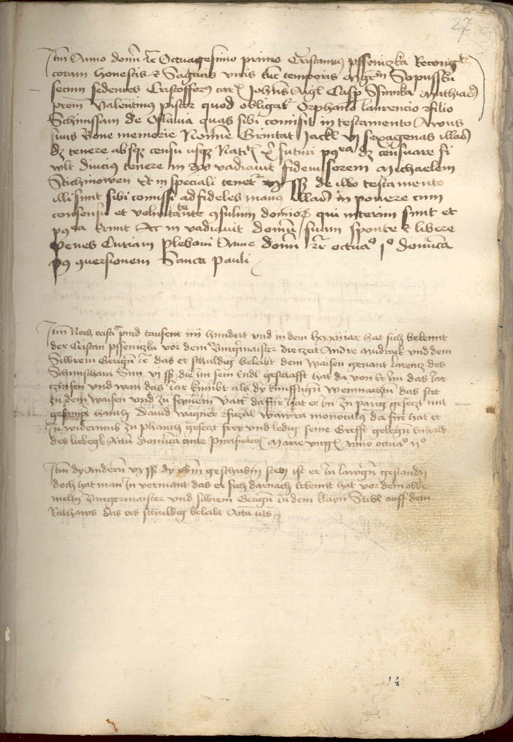 Item anno Domini etc. octuagesimo primo Cristanus Psseniczka recongnovit coram honestis et sagacis viris, tunc temporis magistrocivium Sopussku, secum sedentes Cristofforus carnifex, Iohannes Aigl, Caspar Sumka, Mathias Prem, Valentinus pistor, quod obligatur orphano Laurencio, filio Schimssam de Oslavia, quas sibi comisit in testamento awus suus, bone memorie, nomine Grintat Iackl VI sexagenas, illas debet tenere absque censu usque Nativitatis Cristi futuri, postea debet censuare, si vult1) diucius tenere, inavvadiavit2) fideiussorem Michaelem Stichinowen. Et in speciali tenetur V ½ sex. de illo testamento, illi sunt sibi comissi ad fideles manus, illas inponere cum consensu et voluntate consulum dominorum, qui interim sunt et postea erunt. Ac Invadiavit domum suam sponte et libere penes curiam plebani. Anno domini etc. octuao io dominica post Conversionem sancti Pauli.