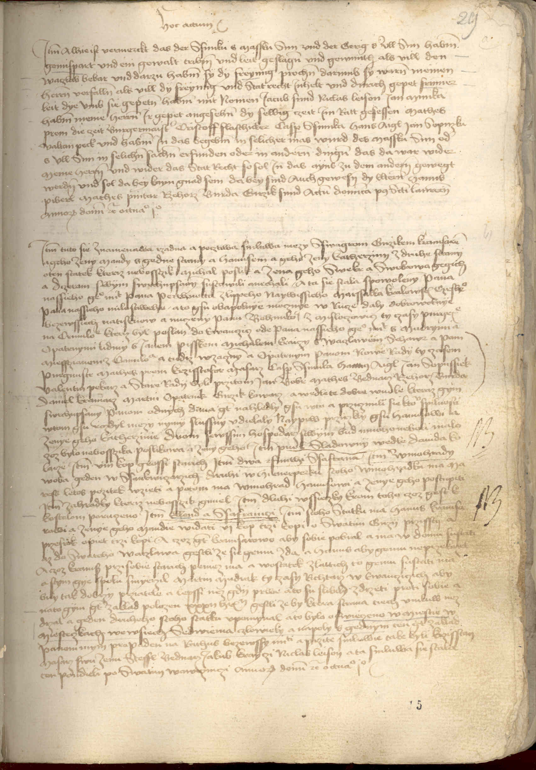 Zde se znamenají nenáležité skutky (špatně, zle činiti – missbaren), kterých se dopustili Maškův syn jménem Šimků, a Ullův syn jménem Gerig. Chovali se násilně (gewalt treiben), tloukli a zraňovali lidi, jmenovitě Václava tkalce. Navíc se ještě tím dopustili porušení svobody (und dazu haben sie die „freyung“ gebrochen). Proto propadli přísnému trestu mým pánům na radnici. Ten trest určuje nejen samo zdejší městské právo, ale i zvláštní ustanovení o (tržní?) svobodě (darum sie waren meinen herren verfallen als viel die „freyung“ und stadtrecht inhaelt). Avšak na požádání zbožných lidí Jakuba kováře, Mikuláše Leisona a Jana Munky, kteří o ně prosili, odpustili jim uvedení radní páni tyto zlé skutky prozatím tímto způsobem. Pokud by byl budoucně Maškův či Ullův syn z podobných skutků usvědčen, nebo kdyby se vůbec dopustil jakéhokoliv skutku proti radním a proti městskému právu, pak ať jim to má být spočítáno jedno s druhým. A pak už nesmí být žádné přímluvy, žádné milosti. Přítomni zde byli také zástupci staré rady Hanuš Piberl, Mathes bednář, Řehoř Burda, Jiří kovář.