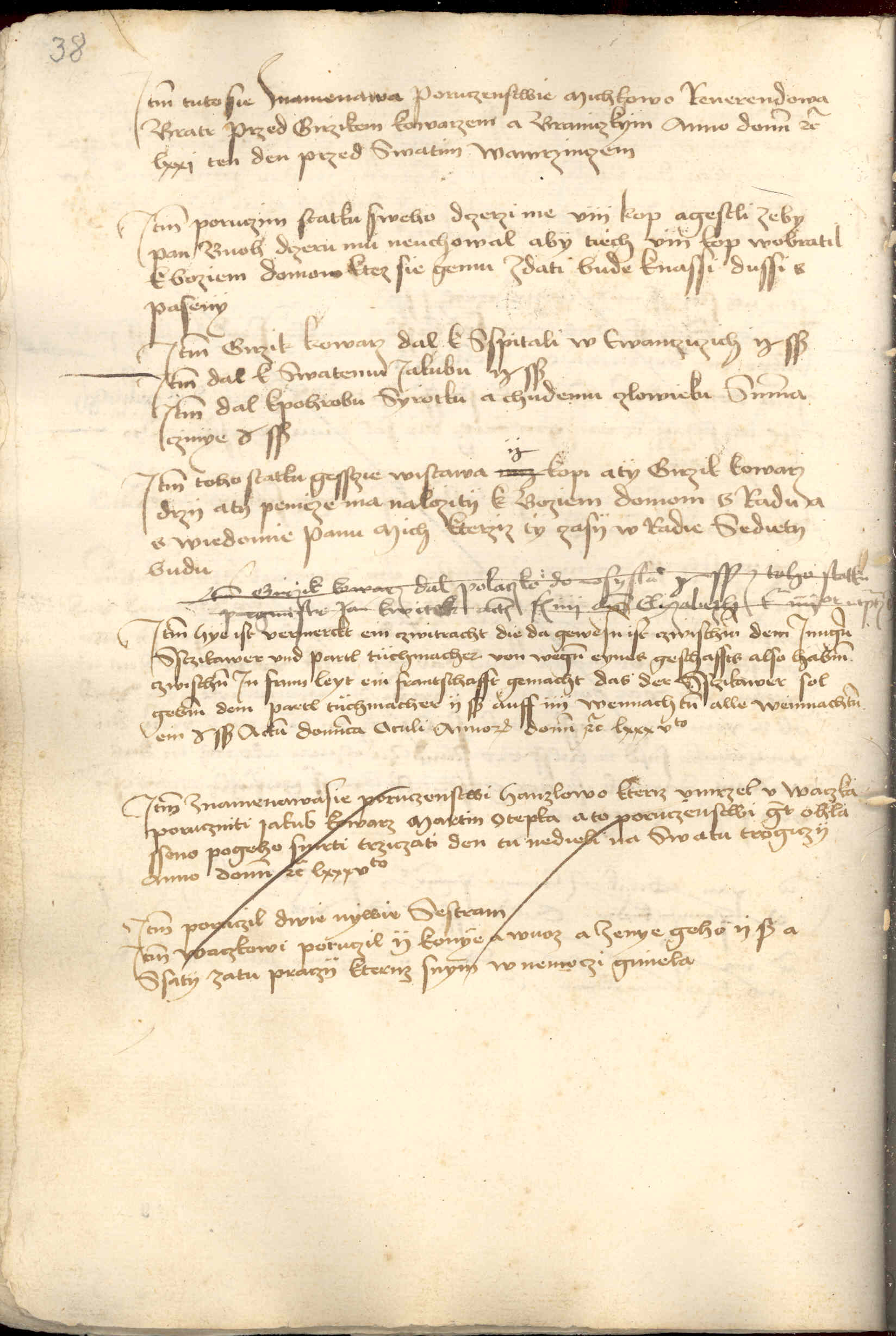 Item znamenawasie poruczenstwi Hanzlowo, kteriz vmrzel v Waczka, poruczniti Iakub kowarz, Martin Otepka. A to poruczenstwi gest ohlasseno pogeho smrti, trziczati den tu nedieli na swatu Trogiczy anno Domini etc. lxxxvto. Item poruczil dwie nywie sestram.6) Item Waczkowi poruczil ii konye a wuoz. A zenye geho II sex. a ssaty za tu praczy, kteruz snym w nemoczi gmiela.7)