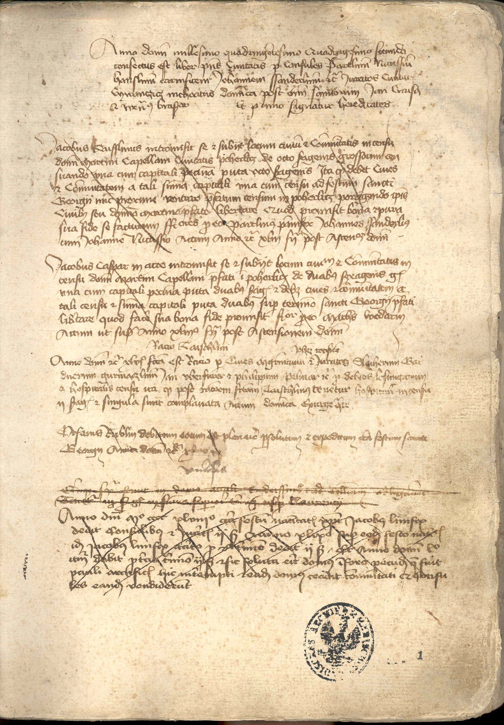 Anno Domini millesimo quadringentesimo quadragesimo secundo confectus est liber presens civitatis per consules Partlinum Nicussium, Hanslinum carnificem, Iohannem Sanderlinum et cetera iuratos civitatis Eyvanczicz. Inchoatus dominica post Omnium sanctorum, Ian Craisa et Wenceslaus braseator. 1)