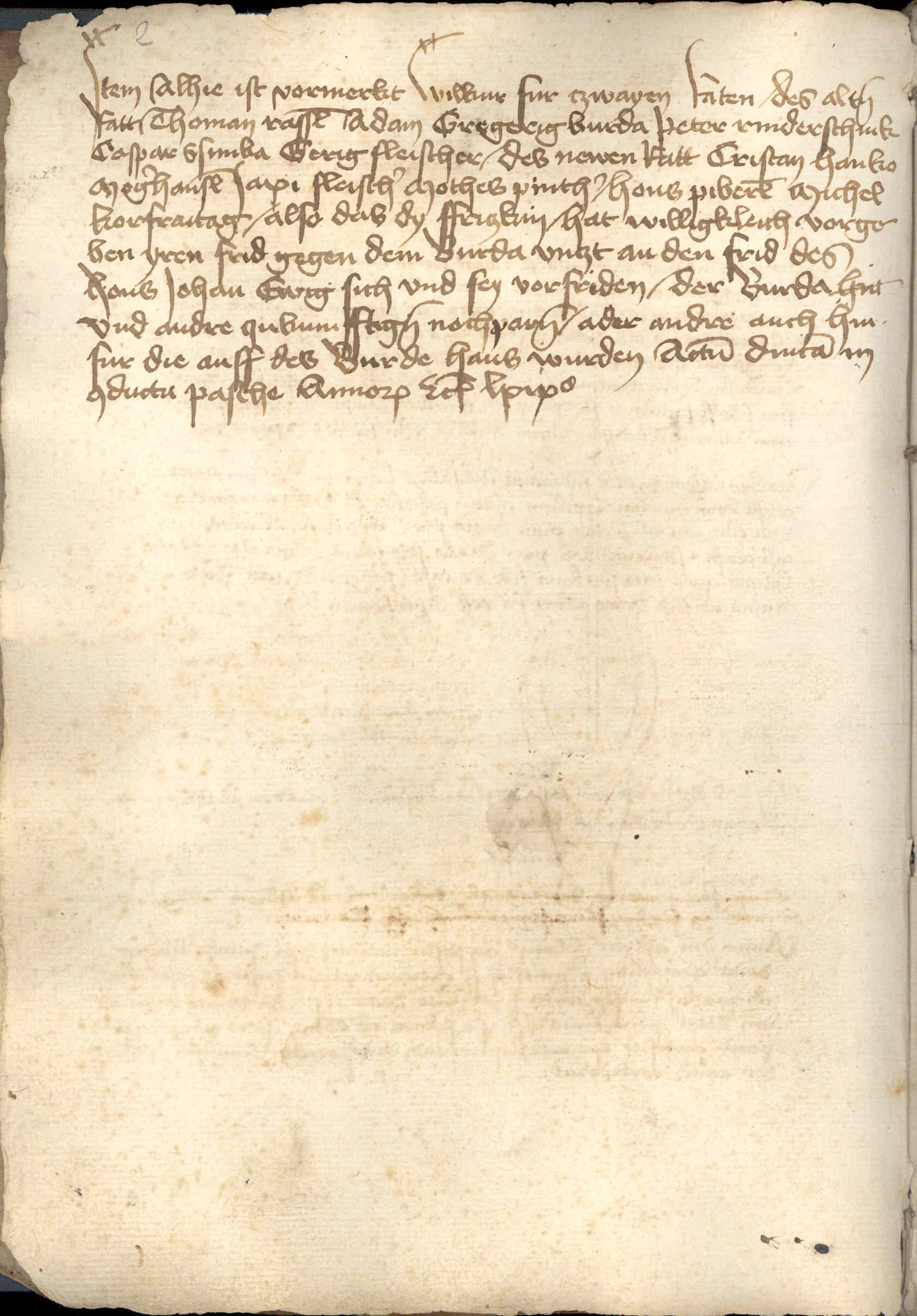 Item alhie ist vormerkt wilkur fur czwayen raten / des alten ratt Thoman Rassel, Adam, Gregerig Burda, Peter Rinderschink, Caspar Sumka, Gerig fleischer / des newen ratt Cristan Hanko, Mogerhansel, Iaxi fleischer, Mothes pinther / Hons Piberle, Michel Korfraitag / also das dy Friczkin / hat willigkhleich vorgeben yren frid gegen dem Burda vnczt an den frid des Hons Iohan ewig sich vnd sey vorfriden / der Burda hnt vnd andre czukumfftigen nochparen / ader andre auch hinfur, die auff des Burde haus wurden. Actum dominica in conductu Pasche, annorum etc. lxixo.
