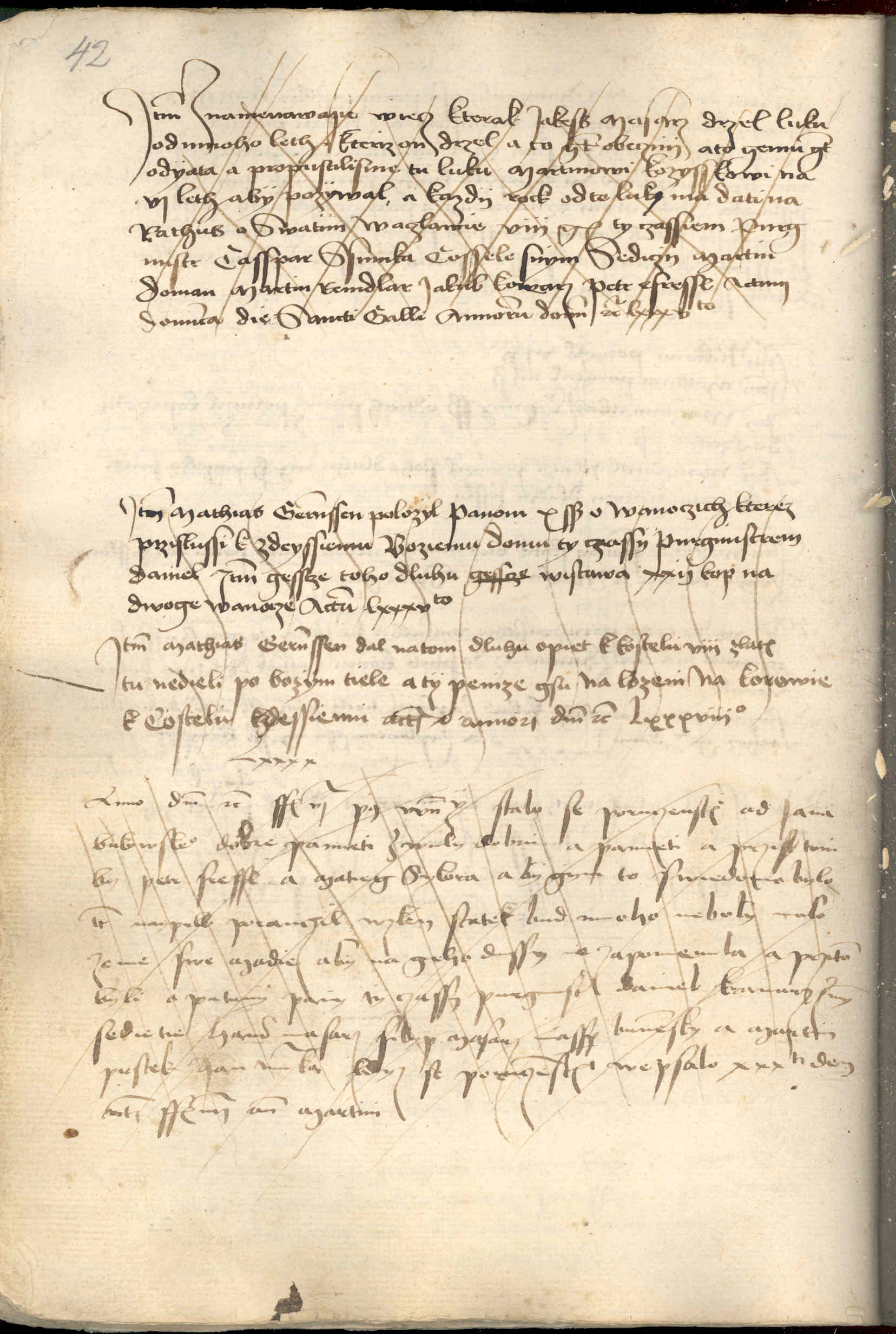 Item Mathias Gerenssen dal na tom dluhu opiet k kostelu VIII zlat. Tu nedieli po Bozym tiele. A ty penize gsu nalozeni na korowie k costelu k zdessiemu, actum d.3) annorum Domini etc. Lxxxviijo.4)