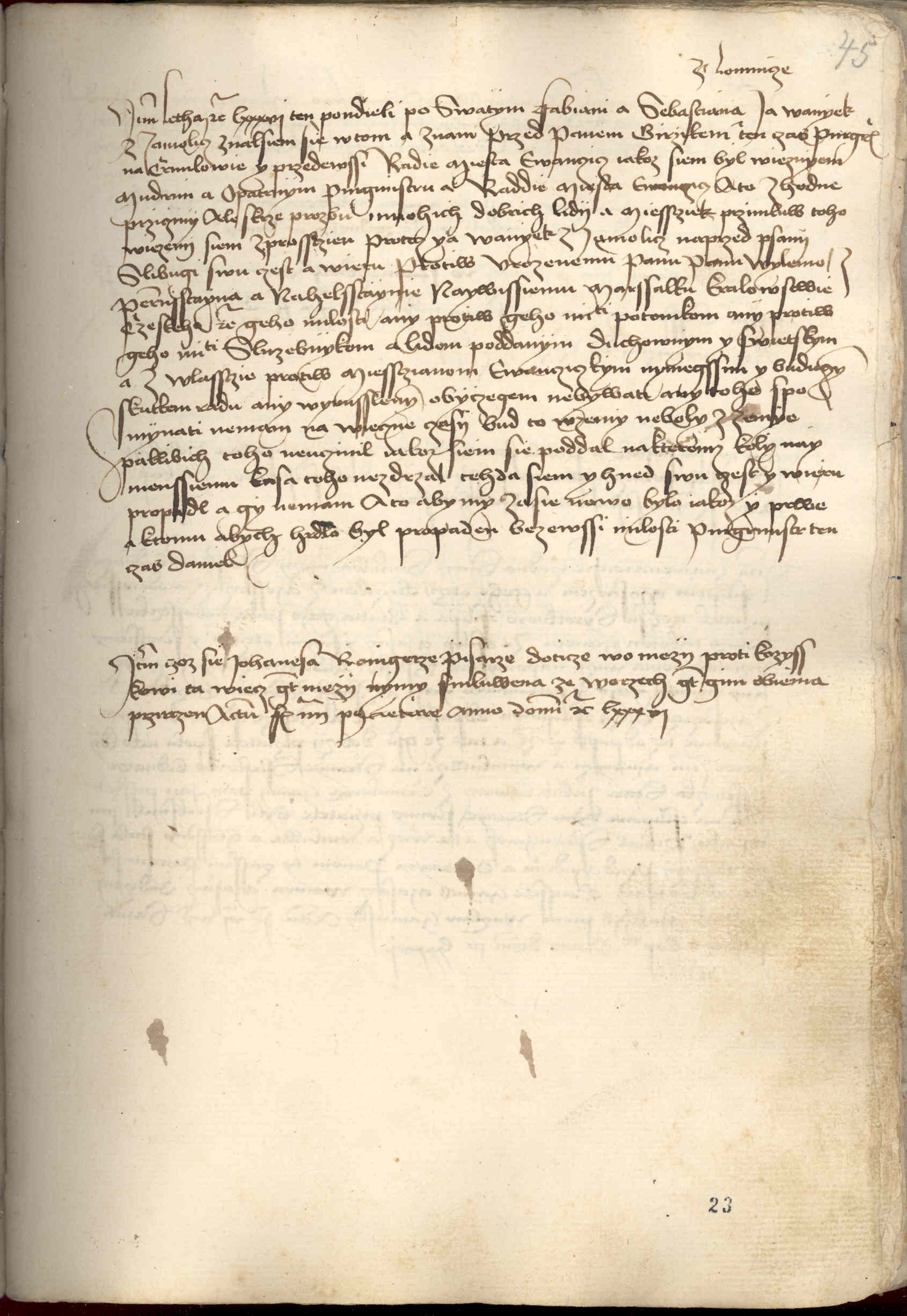 Item czoz sie Iohanesa Renigerze, pisarze doticze wo mezij proti Kozysskowi, ta wiecz gest mezij nymy smluwena, ze worzech gest gim obiema przirczen. Actum feria iiija post Letare anno Domini etc. lxxxvj.