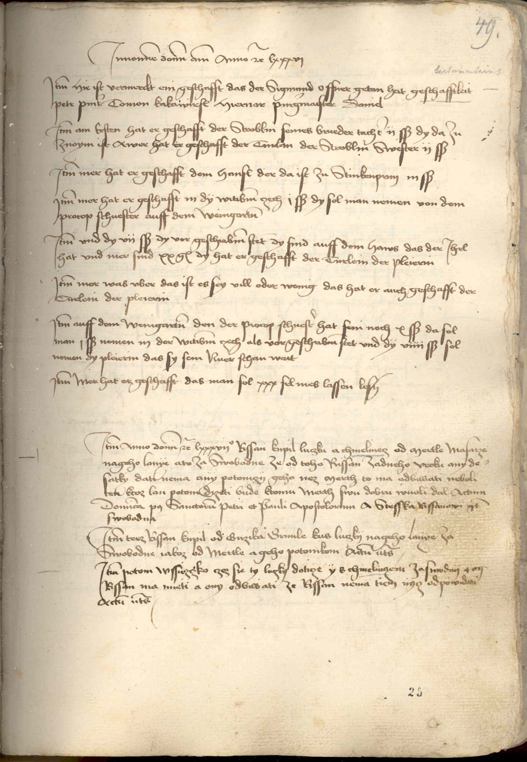 Item mer was vber das ist, es sey vill oder wenig, das hat er auch geschafft der Turlein der Pleierin. Item auff dem weingarten, den der Procop schuester hat sein noch X s., da sol man I s. nemen in der witibem czech, als vorgeschribem stet, vnd dÿ VIIII s. sol nemen dy Pleierin, das sy sein nuer schan wart.2) Item mer hat er geschafft, das man sol XXX sel mes lassen lesen.