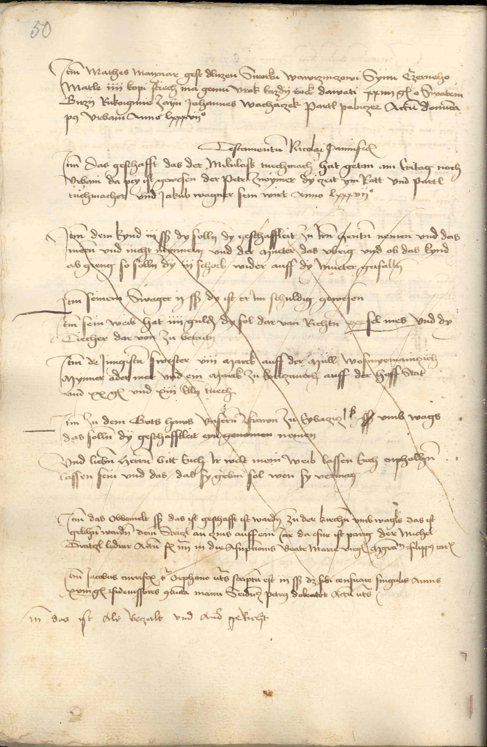 Testamentum Nicolai pannificis Item das geschafft, das der Mikulass tuechmacher hat getan am eritag1) noch Urbani, dapey ist gewesen der Petr Znoÿmer, dy czeit ym ratt, vnd Partl tuchmacher vnd Iakub wagner, sein wirt, anno lxxxvijo. Item dem kynd III s., dy sollen dy geschaffleit zu iren henten nemen, vnd das meren vnd nicht mynneren, vnd der mueter das vbrig. Vnd ob das kynd abgieng, so sollen dÿ III schock wider auff dy mueter gefallen.