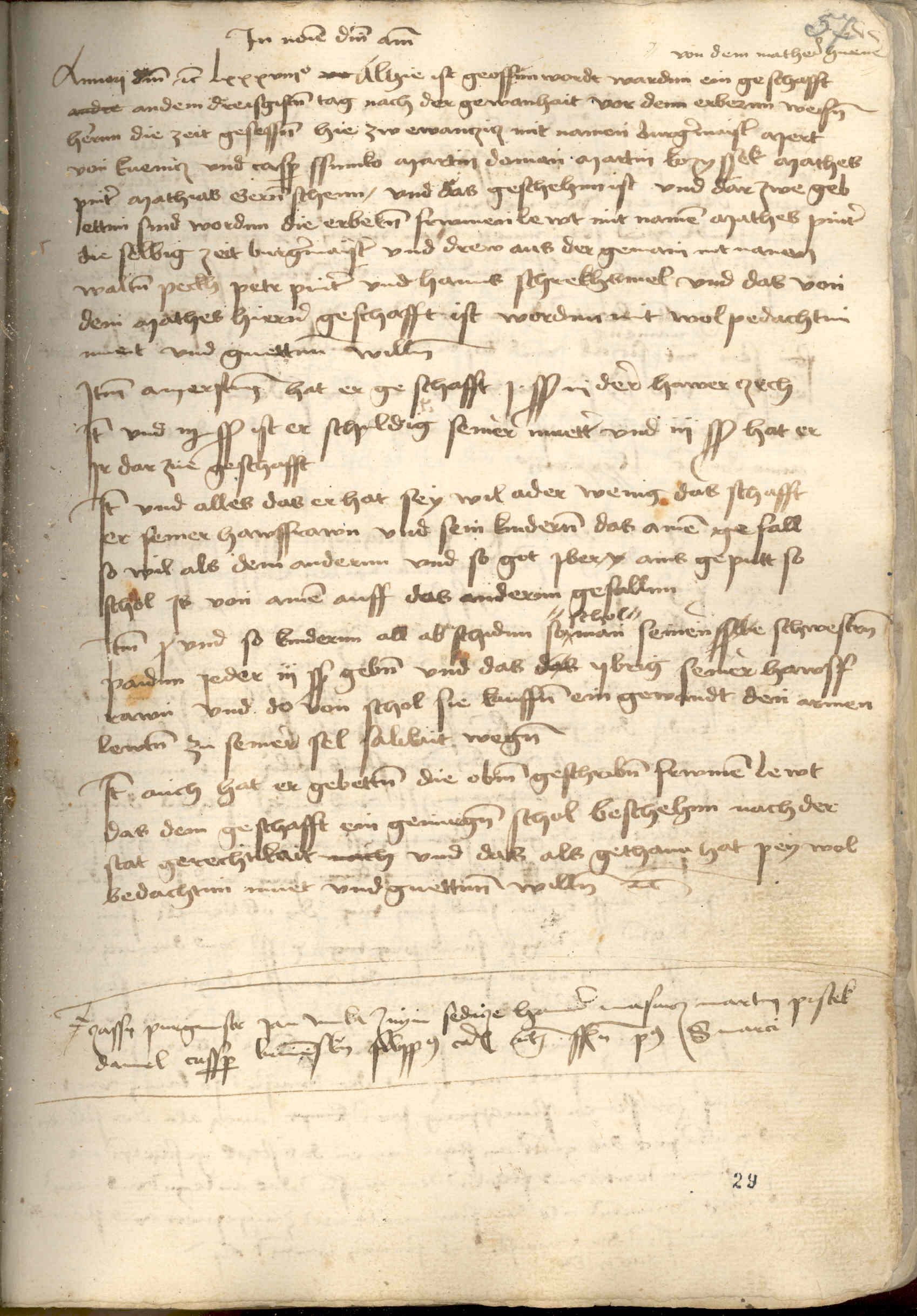Item am erstenn hat er geschafft I s. in der hawer czech. Item vnd II ½ s. ist er schuldig seiner muetter, vnd III s. hat er ir darzue1) geschafft. Item vnd alles, das er hat, sey wil ader wenig, das schafft er seiner hawsfrawn vnd sein kinderen, das ainem gefall, so wil als dem andernn, vnd so Got iber ains geputt, so schol is von ainem auff das andernn gefalnn. Item vnd so kindernn all abschidnn, so schol2) man seinen sswe3) schwestern paidnn, ieder III s., geben, vnd das ibrig seiner hawsfrawn, vnd da von schol sie kauffen ein gewandt den armen lewten zu seiner sel salikeit wegen. Item auch hat er gebetten die obem geschriben frwmen lewt, das dem geschafft ein genuegen schol beschehnn nach4) der stat gerechtikait, nachd vnd da sals gethann hat pey wolbedachtnn muet vnd guettenn willen etc.