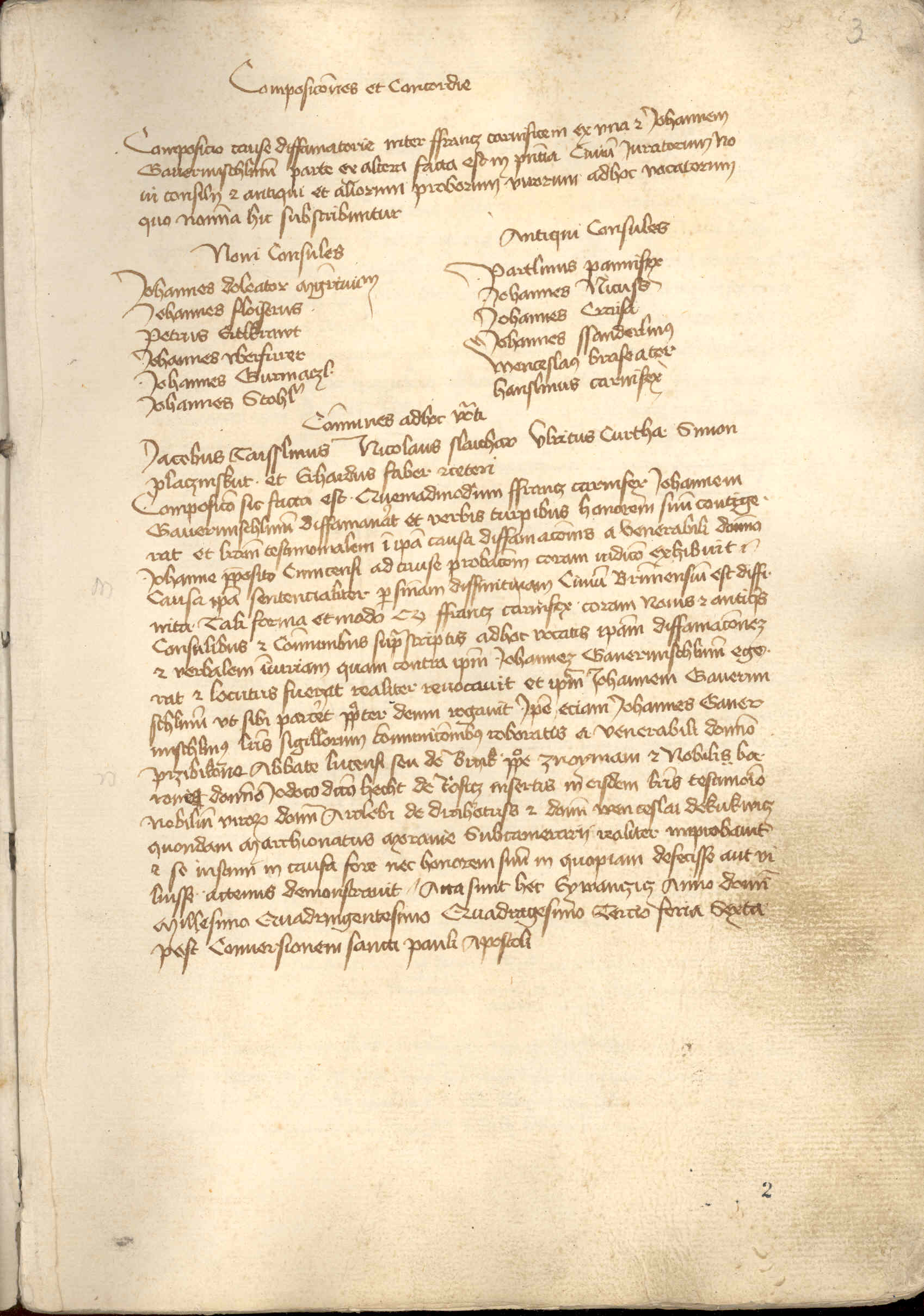 Composicio cause diffamatorie inter Francz carnificem ex una et Iohannem Gauermischlinum parte ex altera facta est in presentia civium iuratorium novi consilii, et antiqui, et aliorum proborum virorum ad hoc vocatorum, quo[rum] nomina hic subscribuntur.