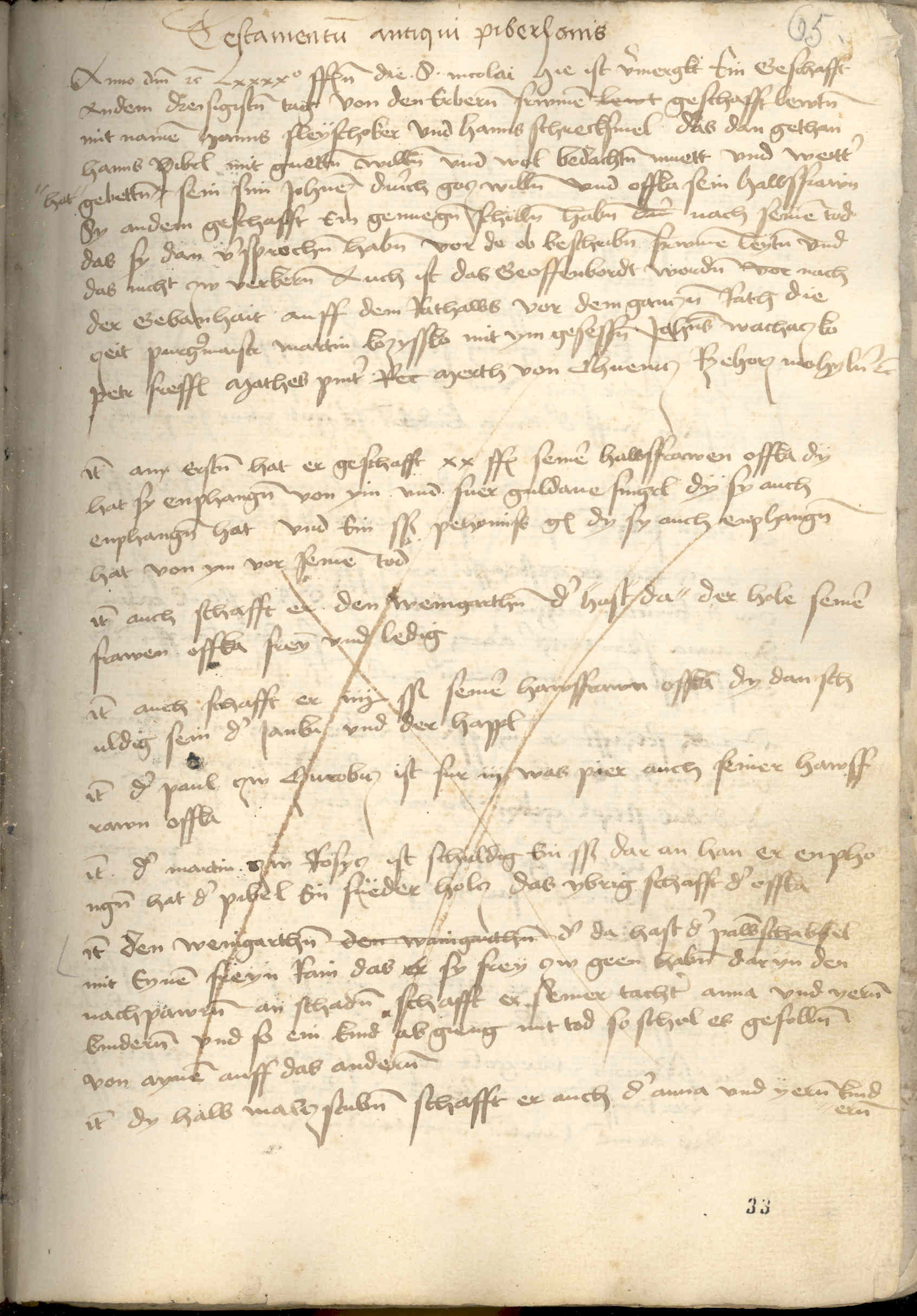 Testamentum antiqui Piberlonis Anno Domini etc. Lxxxxo feria iia die s. Nicolai. Hie ist vermergkt ein geschafft an dem dreisigisten tag von den erberen frumen lewt1) geschafft lewten mit namen Hanns fleÿschoker vnd Hanns Schrecksmel, das dan gethan Hanns Pibrl mit guetten willen vnd wolbedachten muett. Vnd weitter gebetten hat2) sein sun Iohannem, durich Gocz willen, vnd Offka, sein hawsfrawn, sy3) an dem geschafft eingenuegen schollen haben darnach seinem tod, das sy dan versprochen haben vor do obbeschriben frwmen leyten, vnd das nicht zw verkeren. Auch ist das geoffenbordt worden vor4) nach der gebanhait auff dem rathaws vor dem ganczen rath, die czeit purgermaistr Martin Kozyssko, mit ym gesessen Iohannes Wachaczko, Petr Fressl, Mathes pinter, Rer5) Merth von Chuenicz, Rzehorz Mohylner etc.