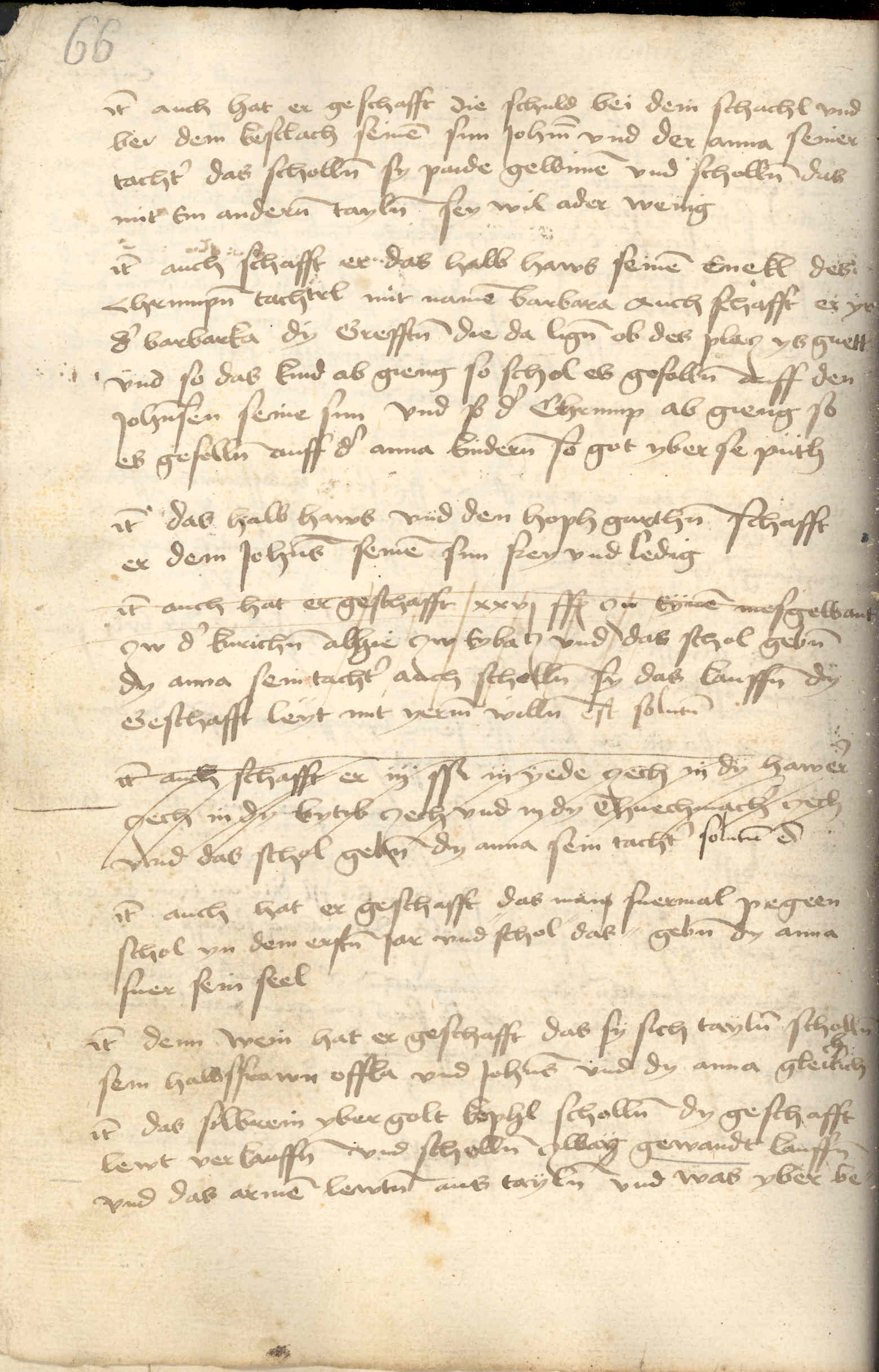 Item am ersten hat er geschafft XX fl. seiner hawsfrawen Offka, dÿ hat sy enphangen von ym vnd fuer guldane fingrl, dy sy auch enphangen hat, vnd ein s. pehemiss gr., dy sy auch enphangen hat von ym vor seinem tod. Item auch schafft er den weingarthen, der da hast der Hole seiner frawen Offka frey vnd ledig. Item auch schafft er III ½ s. seiner hawsfrawn Offka, dy dan schuldig sein6) der Ianku vnd der Happl. Item der Paul czw Czurobicz [Syrovice] ist fur iij was pier auch seiner hawsfrawn Offka. Item der Martin czw Rosycz [Rosice] ist schuldig ein s., daran han er enphongen hat der Piberl ein füeder holcz, das ybrig schafft der Offka. Item den weingarthen den waingarthen7), der da hast8) der Pawenschabfel9) mit eynem freÿn rain, das er10) sy freÿ czu geen haben, darÿn den nachpawren an schaden, schafft er seiner tachter Anna vnd yeren kinderen. Vnd so ein kind abgieng mit tod, so schol es gefollen von aynem auff das anderen. Item dy halb malczstuben schafft er auch der Anna vnd ÿeren kinderen. Item auch hat er geschafft die schuld bei dem Schachl vnd bei dem [Krstlach?] seinen sun Iohannem vnd der Anna, seiner tachter, das schollen sy paide gewinnen vnd schollen das miteinanderen taylen, sey wil ader wenig. Item auch schafft er das halb haws seinem enekl, des Chrumpen tachtrl mit namen Barbara, auch schafft er ÿr der Barbarka dy grefften, die da ligen ob des Placz ys guett. Vnd so das kind abgieng, so schol es gefollen auff den Iohannesen, seine sun, vnd so der Chrump abgieng, so es gefollen auff der Anna kinderen, so Got yber se püth. Item das halb haws vnd den hoph garthen schafft er dem Iohannes, seinem sun, frey vnd ledig.