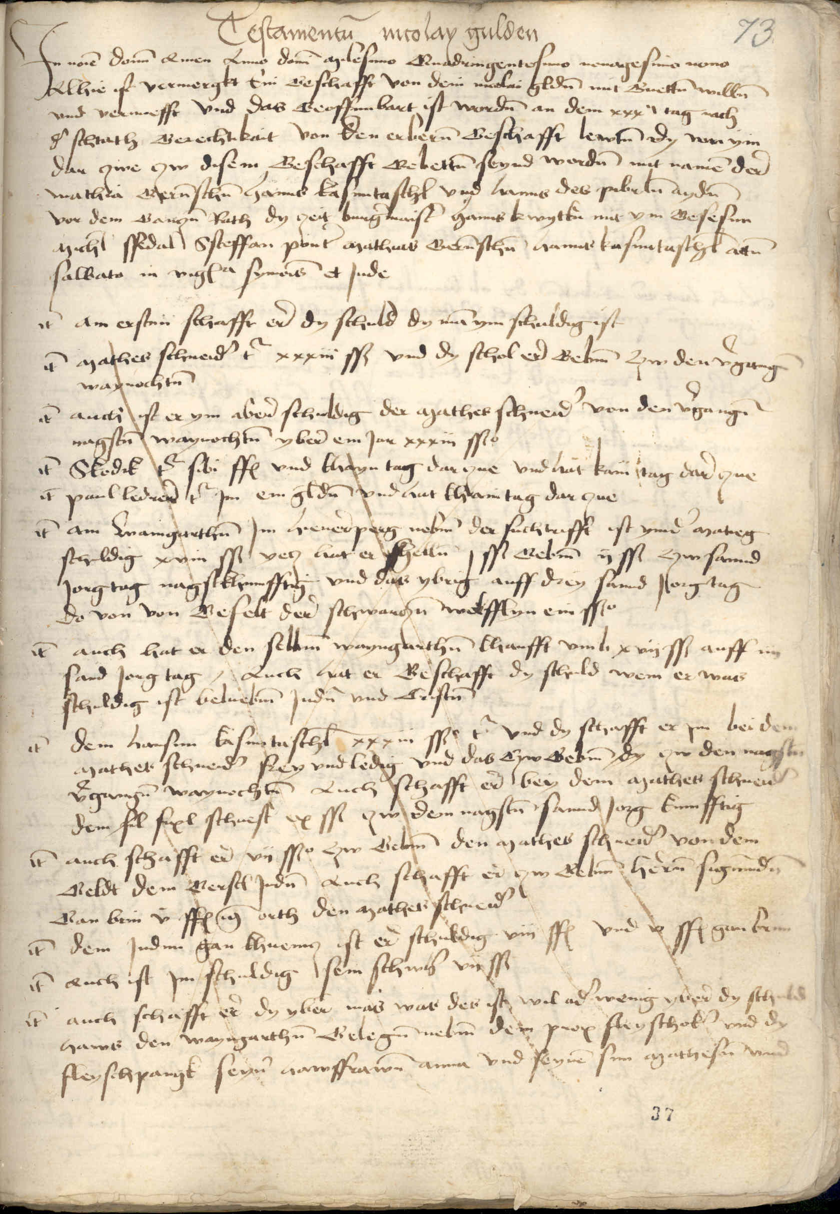 Zde se znamená testament, který se zdravou myslí a dobrou vůlí učinil Mikuláš Gulden. Jeho testament byl zveřejněn po třiceti dnech, a to podle práva města, počestnými lidmi, kteří byli k tomu jako poručníci závěti připrošeni: Matyášem Gerenšenem, Hansem Kasuntašlem a Hansem, zetěm Piberlovým. Bylo to zapsáno před celou radou, toho času purkmistrem Hanušem Kvítků, Michelem Šedalem, Štefanem bednářem, Matyášem Gerenšenem a Hansem Kasuntašlem, v sobotu v předvečer svátku Šimona a Judy.