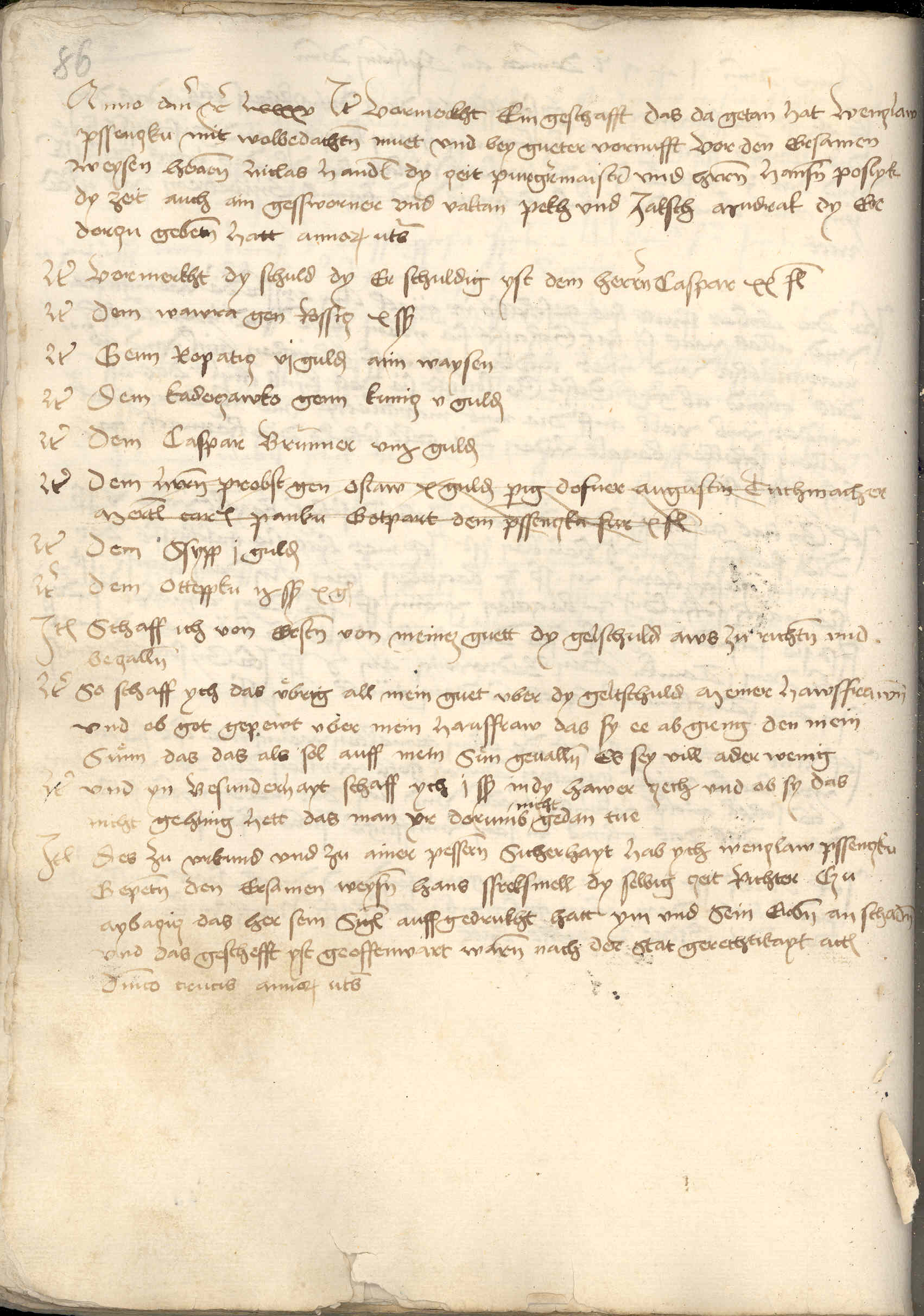 Item vormerkht dy schuld, dy er schuldig yst dem heren Caspar XX fl. Item dem Wawra gen Rossicz X s. Item genn Ropaticz [Rapotice] VI gulden aim1) waysen. Item dem Kaderzawko genn Kunicz V gulden. Item dem Caspar Brunner VII ½ gulden. Item dem herren probst gen Oslaw X gulden, parig dofuer Augustin tuchmacher, Mertel carnifex, Panku Gotpart, dem Pssenczka fur X fl.2) Item dem Ssypp I gulden. Item dem Otteppku I ½ s. X gr.