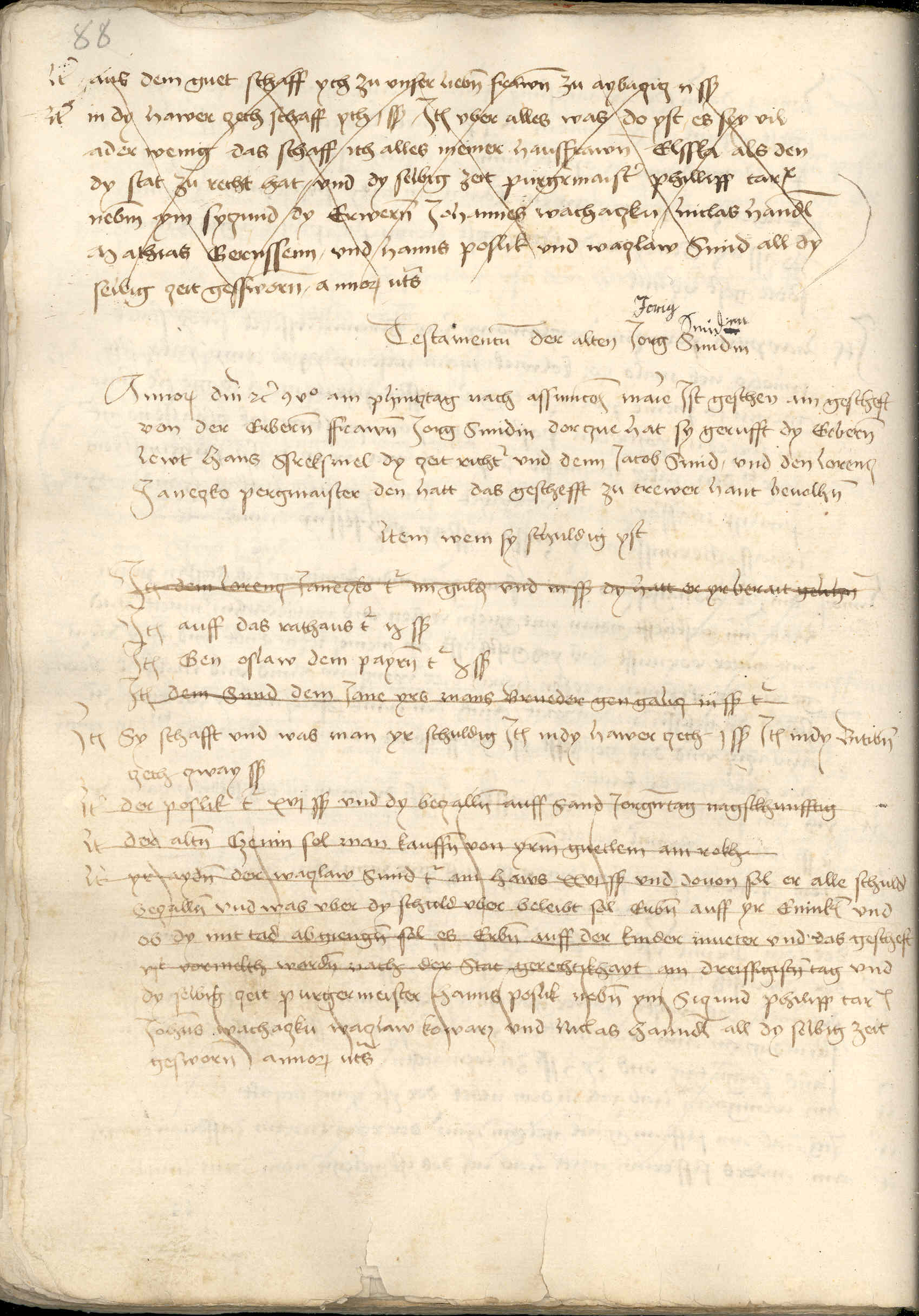 Testamentum der alten Iorg smidin1) Annorum domini etc. 9vo am phincztag nach Assumcionis Marie ist geschen ain gescheft von der erberen ffrawen Iorg smidin. Dorczue hat sy gerufft dy erberen lewt Hans Sreksmel, dy czeit richter vnd denn Iacob smid / vnd den Lorencz Ianeczko, pergmaister, den hatt das geschefft zu trewer hant bevolhen.