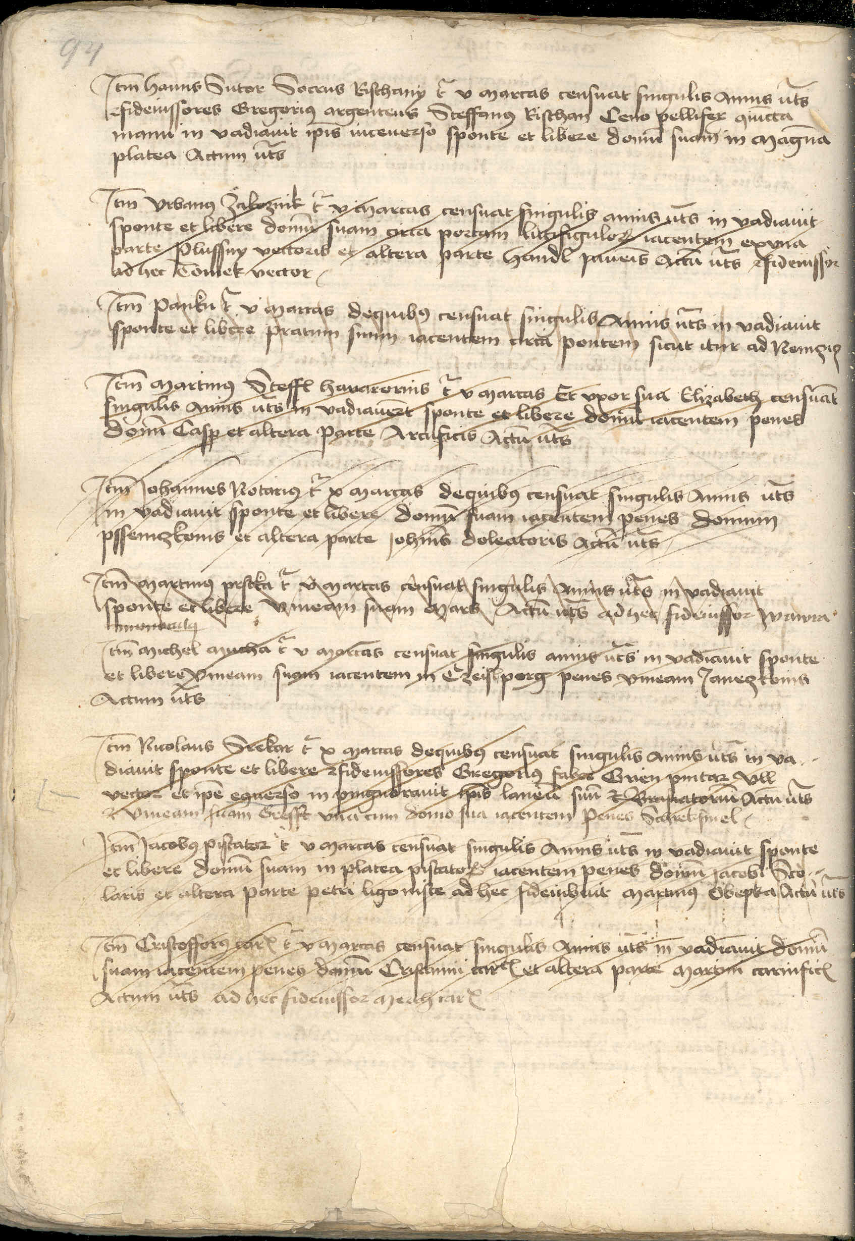 Item Iohannes notarius tenetur X marcas, de quibus censuat singulis annis ut supra,9) invadiavit sponte et libere domum suam iacentem penes domum Psseniczkonis et altera parte Iohannis doleatoris, actum ut supra.10)