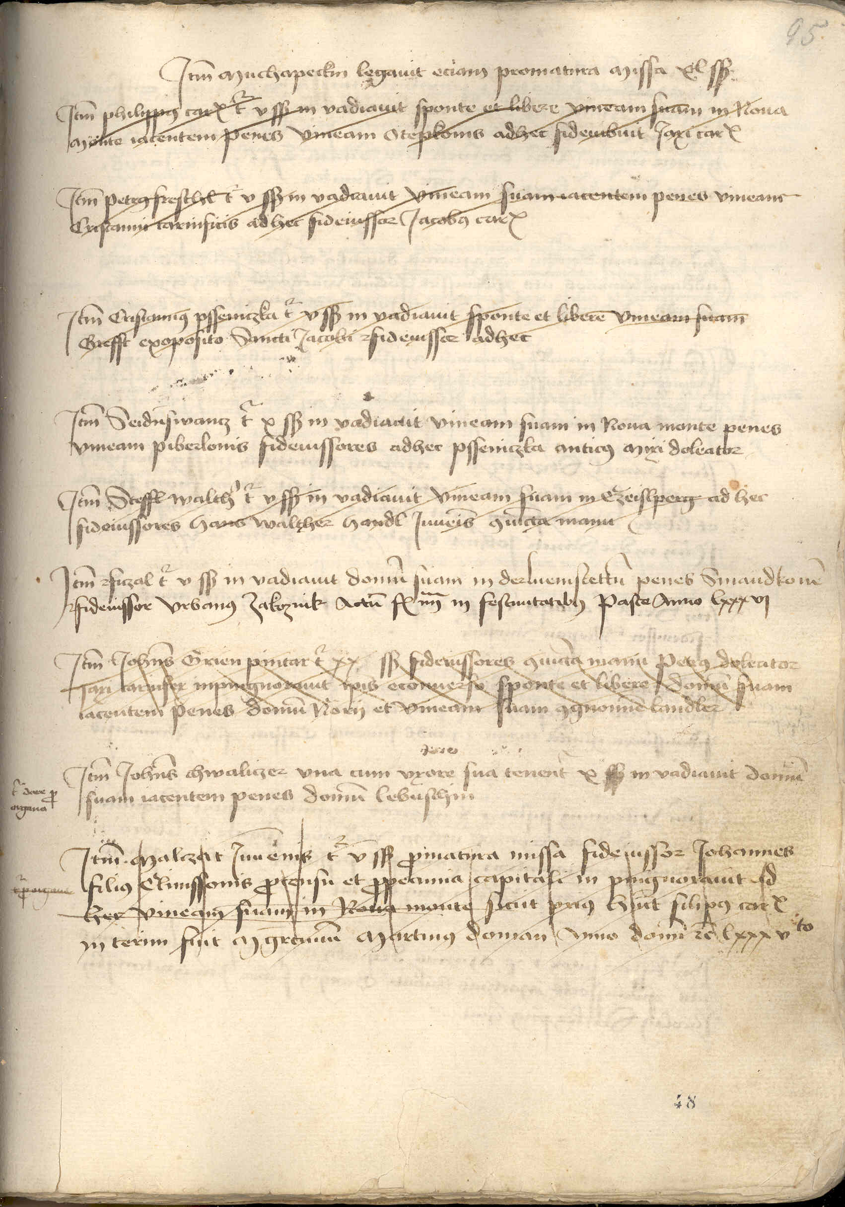 Celý zápis je škrtnut šikmými čarami. „fideiussor ad hec…“ jméno nedopsáno.