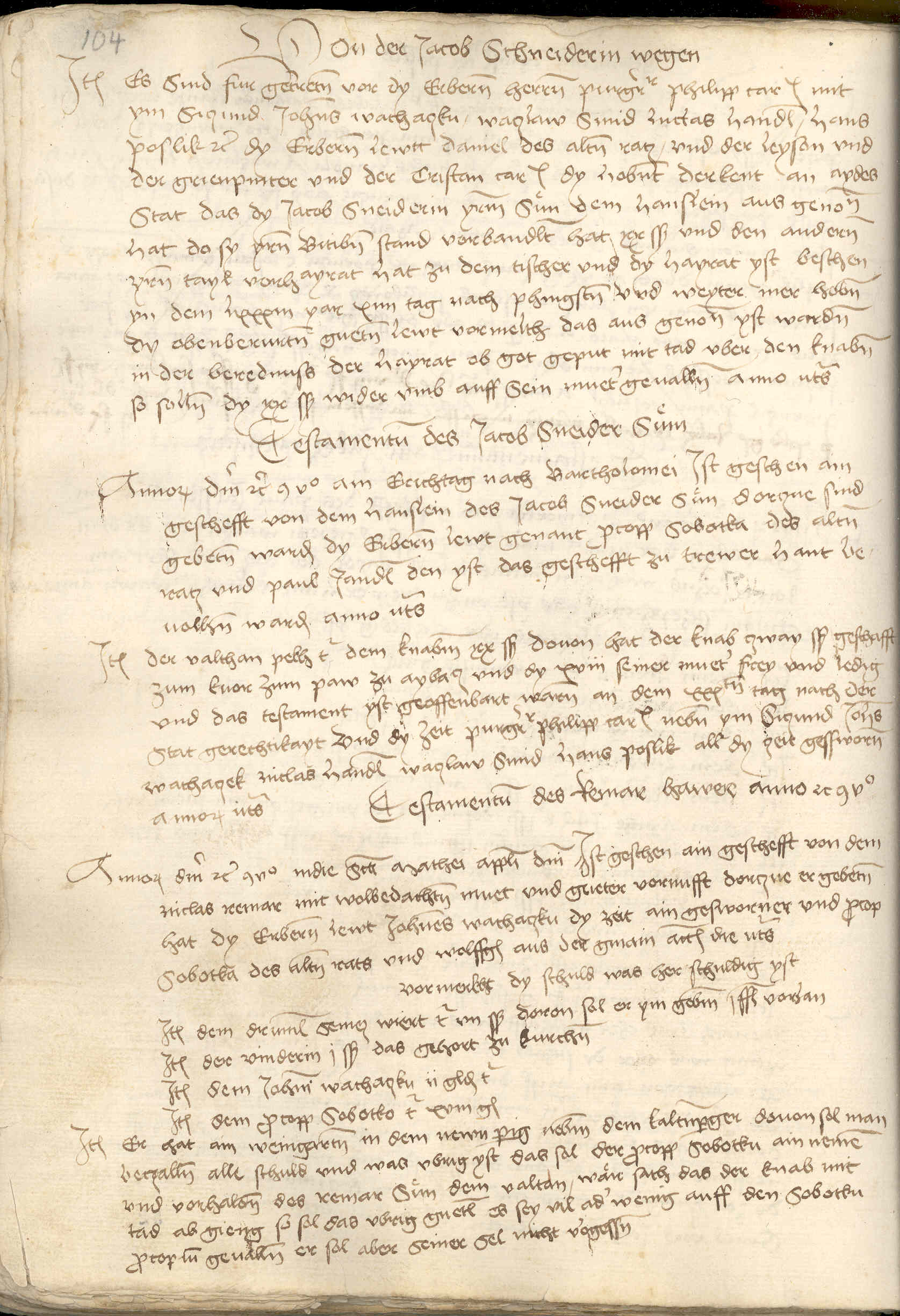 Item der Valthan pekh tenetur dem knabem XX s., dovon hat der knab czway s. geschafft zum kuor zum paw zu Aybacicz, vnd dy XVIII seiner mueter, frey vnd ledig. Vnd das testament yst geoffenbart waren an dem xxxtn tag nach der stat gerechtikayt vnd dy zeit purgermaister Philipp carnifex, neben ym siczund Iohannes Wachaczek, Niclas Handel, Waczlaw smid, Hans Poslik, all dy czeit gessworen, annorum ut supra.