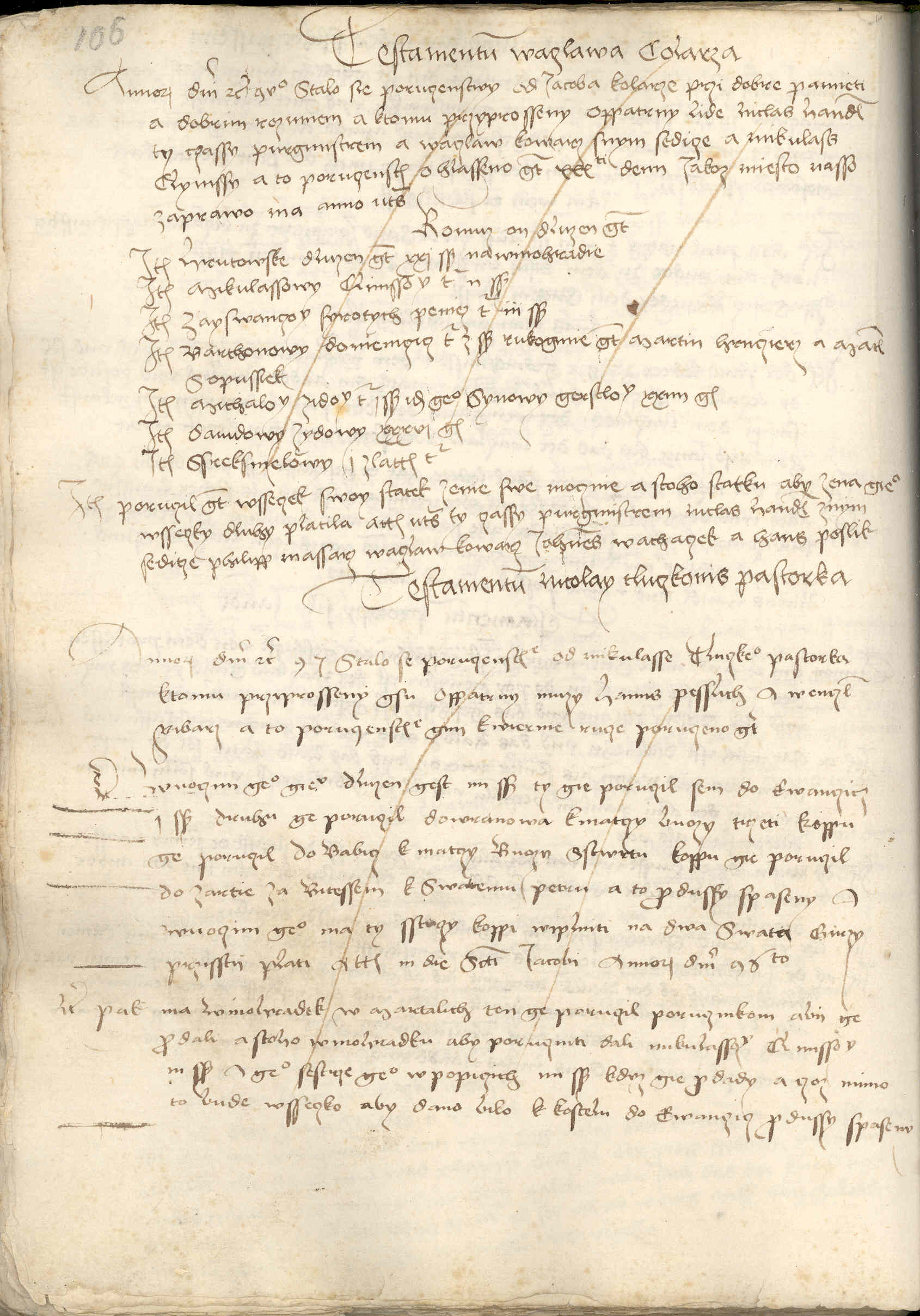 Testamentum Waczlawa colarza Annorum Domini etc. 9vo stalo se poruczenstwy od Iacoba kolarze przi dobre pamieti a dobrim rozumem. A k tomu przyprosseny oppatrny lide Niclas Handel, ty czassy purkmistrem, a Waczlaw kowarz, s nym sedicze, a Mikulass Clymssy, a to poruczenstwy ohlasseno gest xxxti denn, iakoz miesto nasso za prawo ma, anno ut supra.