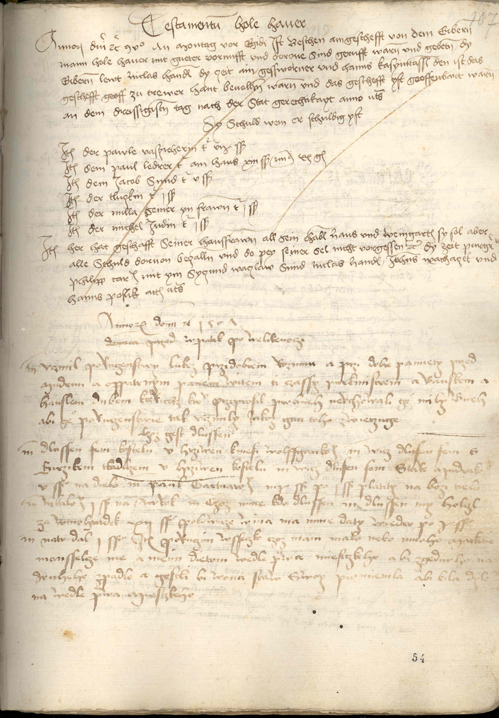 Zde se znamenají dluhy. Vdově Pavla povozníka dluží šest a půl kop grošů. Pavlovi kožaři dluží na domě třináct kop bez dvaceti grošů. Jakubu kováři dluží pět kop grošů. Tlučkové dluží jednu kopu grošů. Míle, své hospodyni, dluží jednu kopu grošů. Vdově od Michela žida dluží jednu kopu grošů. Všechen svůj majetek odkázal své ženě, dům i vinohrad, aby z něj zaplatila všechny dluhy, také aby na jeho duši nezapomněla. A to se stalo za purkmistra Filipa řezníka a radních Václava kováře, Mikuláše Handla, Jana Vacháčka a Hanse Poslíka.