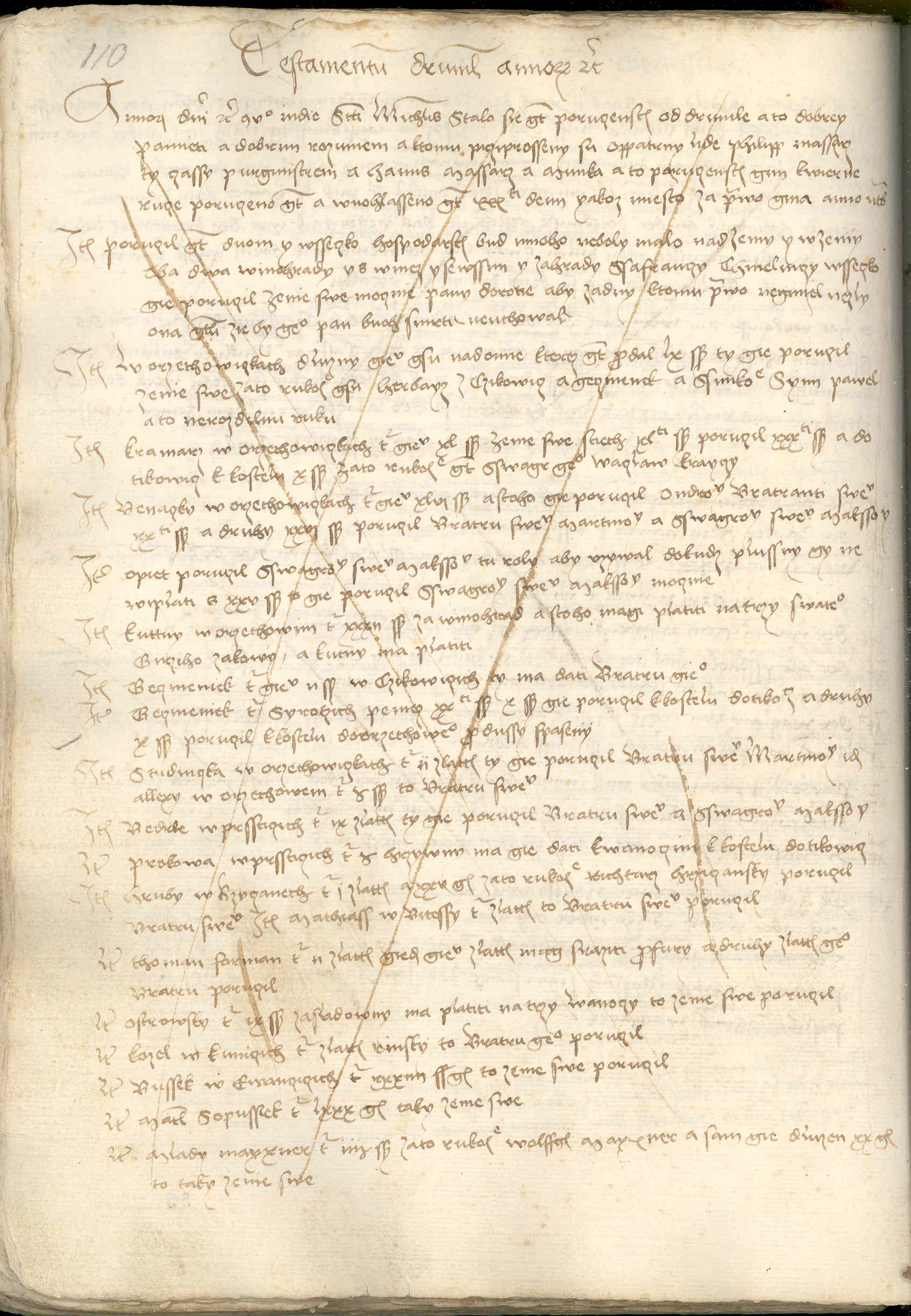 Testamentum Drumel, annorum etc. Annorum Domini etc. 9vo in die sancti Michaelis stalo sie gest poruczenstwy od Drumle, a to dobrey pamieti a dobrim rozumem. A k tomu prziprosseny su oppatrny lide Philipp massarz, ty czassy purkmistrem, a Hanns massarz a Munka. A to poruczenstwy gim k wierne rucze poruczeno gest a wuohlasseno gest xxxti denn, yakoz miesto za prawo gma, anno ut supra.