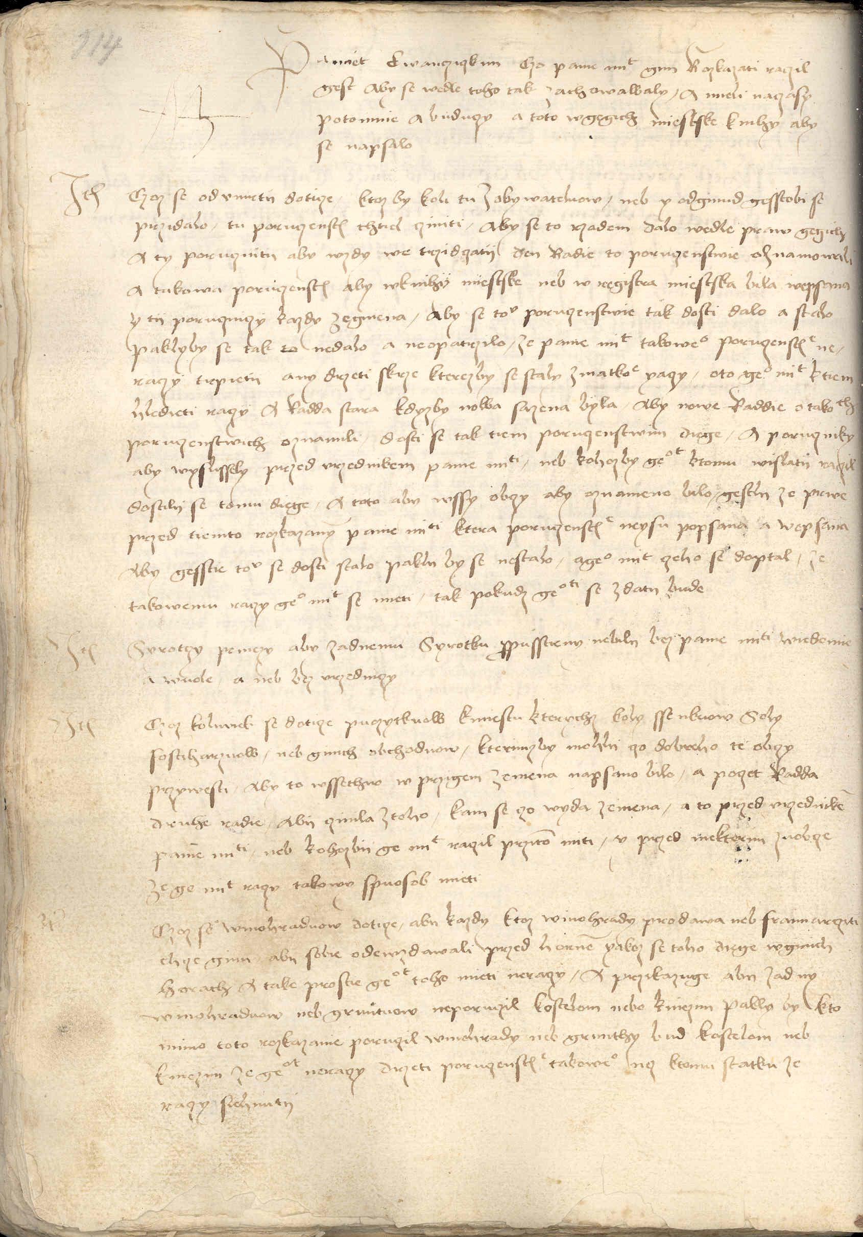 Item czoz kolwiek se doticze puozytkuow k miestu, kterychz koly ssenkuow, soly, fostiharzuow neb ginich obchoduow, kterimzby mohli czo dobreho te obczy przywesti, aby to wssechno w przigem zemena napsano bilo. A poczet radda druhe radie abij czinila z toho, kam se czo wyda zemena, a to przed vrzednikem Panie Milosti neb kohozbii Geho Milost raczil przitom miti, y przed niekterymi zuobcze, ze Geho Milost raczy takowy spuosob mieti. Czoz se winohraduow doticze, abii kazdy, ktoz winohrady prodawa nebo fraimarcziti chce [ginu?], abij sobie odewzdawali przed hornem, yakoz se toho diege w ginich horach. A take prostie Geho Milost toho mieti neraczy a przikazuge, abij zadny winohraduow nebo gruntuow neporuczil kostelom nebo kniezim. Pakly by kto mimo toto rozkazanie poruczil winohrady neb grunthy – bud kostelom neb kniezim, ze Geho Milost neraczy drzeti poruczenstwie takoweho, nez k tomu statku ze raczy siehnutij.