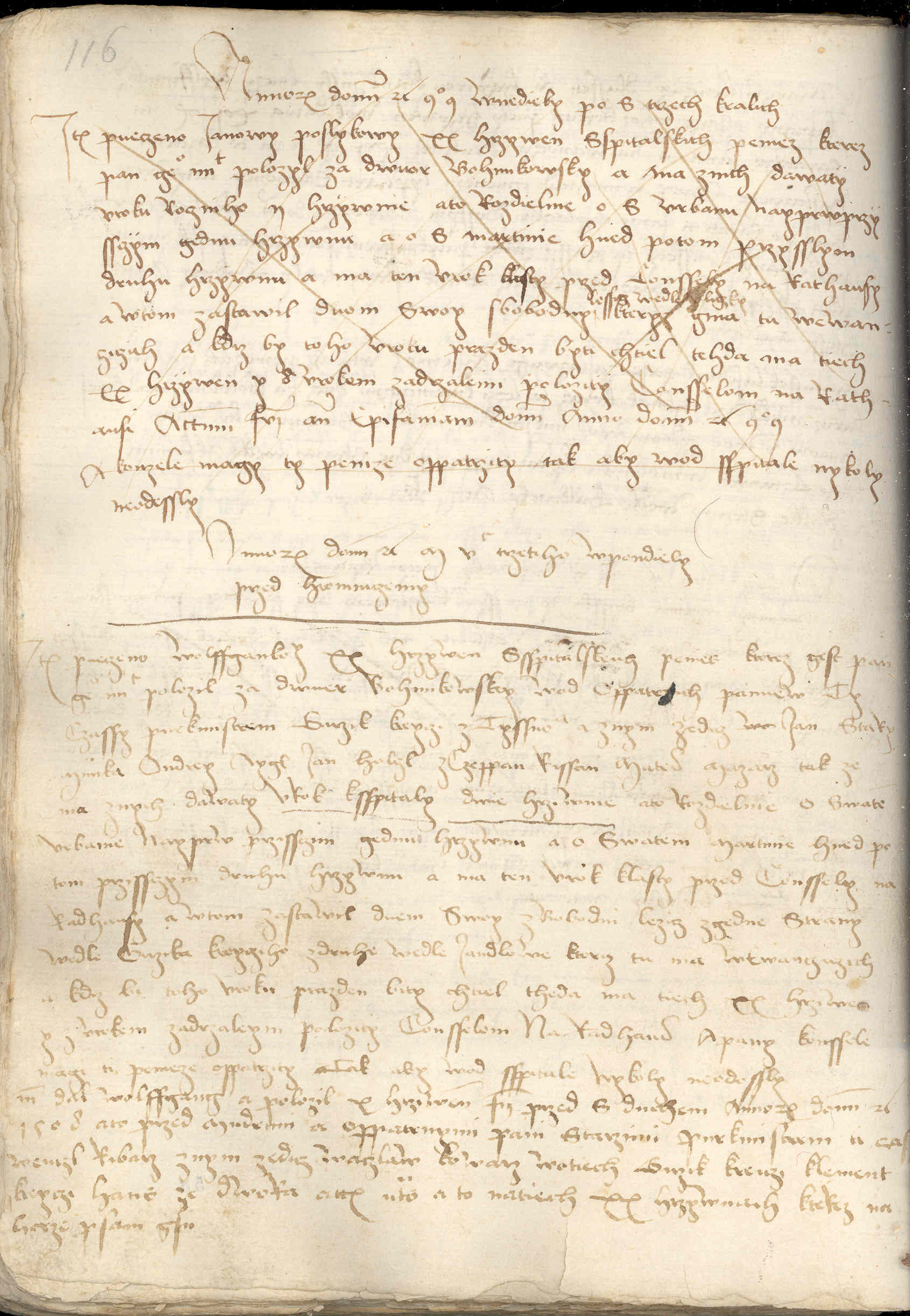 Annorum Domini etc. MVc trzetiho w pondiely przed Hromniczemy Item pueczeno Wolffgankowy XX hrzywen ssspitalskeich penies, kterez gest pan Geho Milost polozil za dwuer Bohunkowskey, wod oppatrnich panuew, ty czassy purkmistrem Girzik kreyczi z Tyssnowa, a z nym zedicz wo3) Ian stary Munka, Ondrey Aygl, Ian Holczl, Zczeppan Rissan, Mates mazarz. Tak ze ma z nych dawaty vrok k sspitaly dwie hrziwnie,4) a to rozdielnie o swatem Vrbanie nayprw przissczim gendu hrzywnu a o swatem Martinie hned po tom przissczym druhu hrzywnu. A ma ten vrok klasty przed conssely na radhausy. A w tom zastawil duem swoy zbobodni, lezicz z gedne strany wedle Girzika kreycziho, z druhe wedle Iandlowe, kteraz tu ma w Ewancziczich. A kdiz bi toho vroku prazden bity chtiel, theda ma tiech XX hrziwen y z vrokem zadrzaleym polozity consselom na radhaus. A pany konssele magi ti penieze oppatrzity tak, aby wod sspitale nykoly neodessly.5)