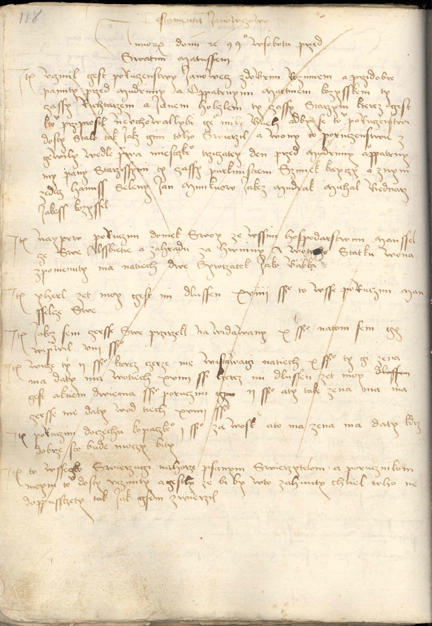 Annorum Domini etc. 99o w sobotu przed swatim Matessem Item vczinil gest poruczenstwy Ianowecz, z dobrim rozumem a przi dobre pamity, przed mudrimy a oppatrnymi Martinem Kozysskem, ty czassy richtarzem, a Ianem Holczlem, ty czassy starzym, kterez gest k tomv prziprosil. Nevchowallybi geho mily Bueh, adby se tomv poruczenstwi dosty stalo, tak iakz gim toho swierzil. A wony to poruczenstwie zgewily wedle prawa miestczkeho triczatey den przed mudrimy a oppatrnymy pany starzissymi, ty czassy purkmistrem Szimek kreyczy, a z nym zedicz Hanuss Seleny, Ian Munkuow, Iakez Mudrak, Michal bednarz, Iakess Kozyssek.