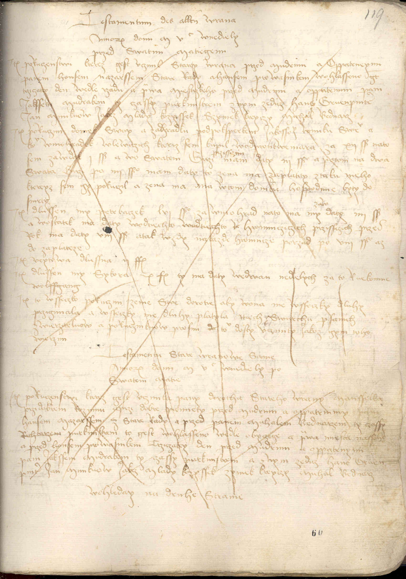 Annorum domini MVc w nediely przed swatim Matiegem Item poruczenstwi, kterez gest vczinil stary Wrana przed mudrimi a oppatrneymi panem Honsem mazarssem, stare rady, a Hansem prowasnikem. Wohlasseno gest trziczaty den wedle rzadu a prawa miestczkeho pred mudrimi a oppatrnimi pani Iakssem Mudrakem, ty czyssy purkmistrem, z nym zedicz Hans Gruenpinter, Ian Munkuow, Iakez – mlady Kozyssek, Szymek kreyczy, Michal bednarz.