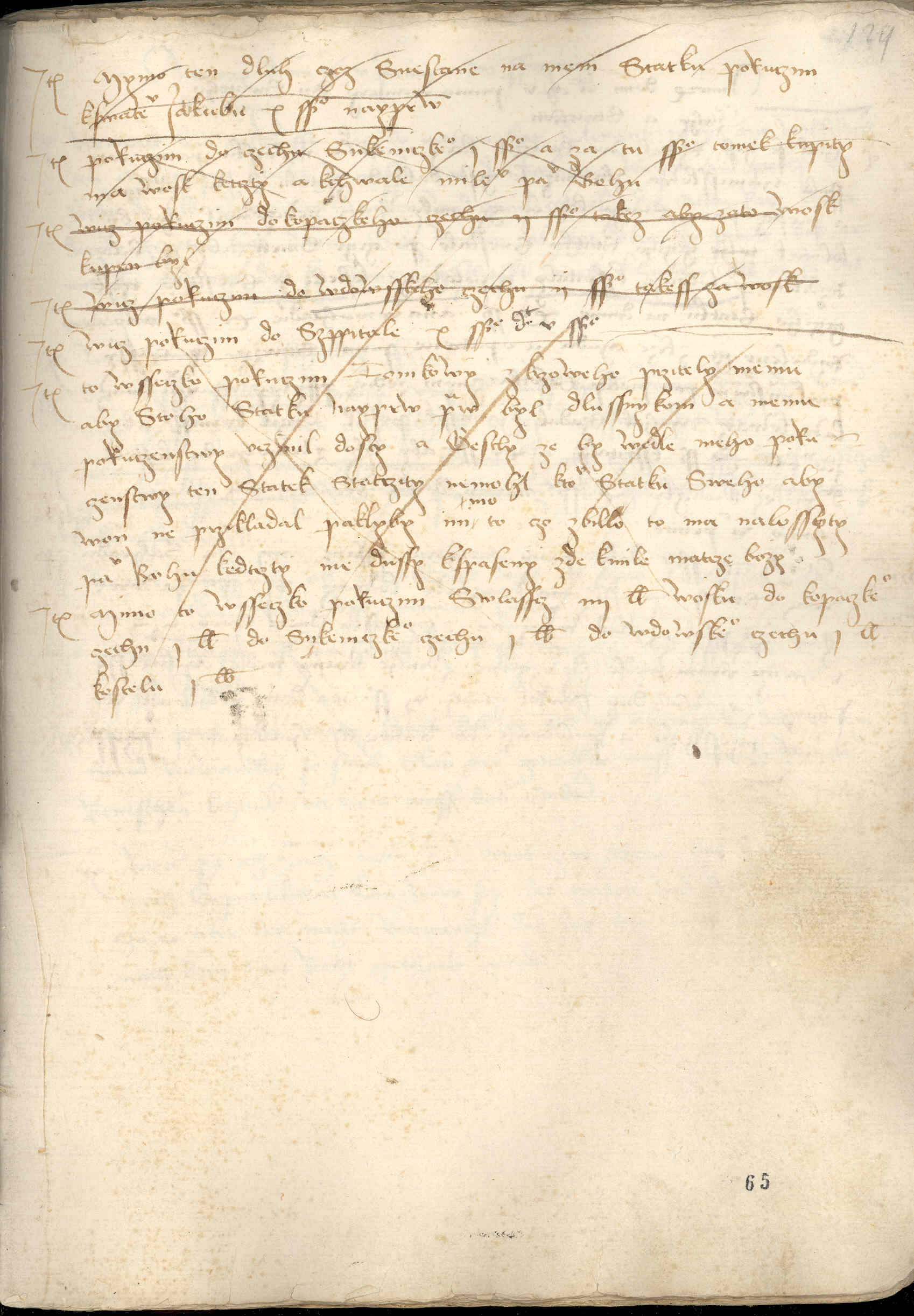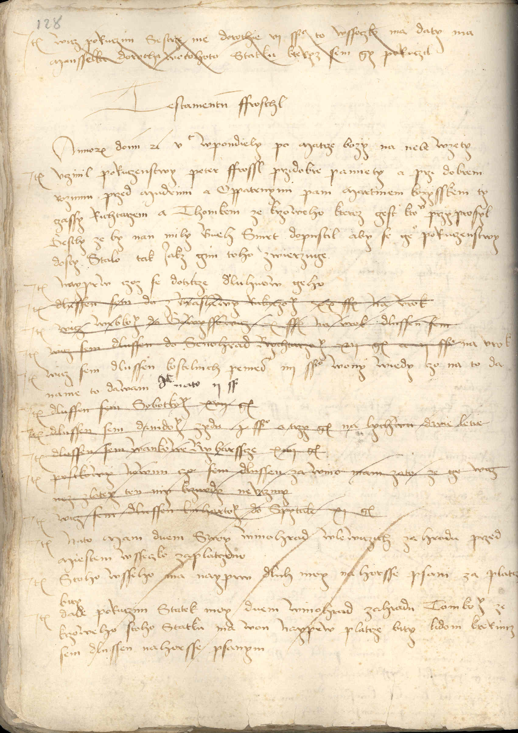 Item dale poruczim statek moy, duem, winohrad, zahradu Tomkowy ze Krzoweho, s toho statku ma won nayprw platcze bity lidom, kterimz sem dlussen, na horsse psanym. Item mymo ten dluh, czoz suestane na mem statku, poruczim k swatemv Jakubu X s. nayprw. Item poruczim do czechu sukeniczkeho I s., a za tu s. Tomek kupity ma wosk ke tczty a k chwale milemv Panv Bohu. Item wicz poruczim do kopaczkeho czechu II s., takez aby za to wosk kupen byl. Item wicz poruczim do wdowsskeho czechu II s., takess za wosk. Item wicz poruczim do szppitale X s. Dedit V s.b Item to wsseczko poruczim Tomkowy z Krzoweho, przitely memu, aby s toho statku nayprw praw byl dlussnykom a memu poruczenstwy vczinil dosty. A gestly ze by wedle meho poruczenstwy ten statek statczity nemohl, k tomv statku sweho aby won neprzikladal. Paklyby mimo1) to czo zbillo, to ma nalossyty panv Bohu kedtczty me dussy k spaseny zde k mile Matcze Bozy. Item mimo to wsseczko poruczim swlasscz IIII libry wosku do kopaczkeho czechu, I libru do sukeniczkeho czechu, I libru do wdowskeho czechu, I libru kostelu, I libru.2)