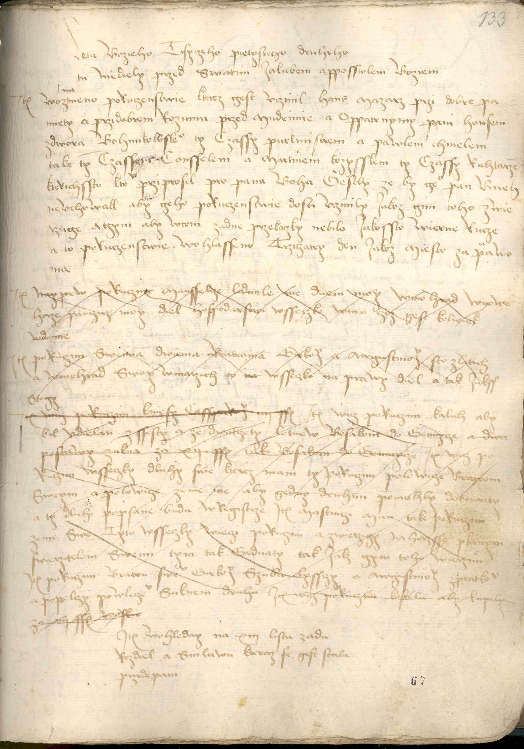 Leta bozieho tisyzeho pietysteho druheho, tu niediely przed swatim Jakubem, apposstolem boziem Item woznameno1) poruczenstwie, kterez gest vczinil Hans mazarz przi dobre pamiety a przi dobrem rozumu przed mudrimie a oppatrnymy pani Honsem z dwora Bohunkowskeho, ty czassy purkmistrem, a Pawlem Chmelem, take ty czassy consselem, a Martinem Kozysskem, ty czassy richtarzem, kterichssto k tomv prziprosil pro pana Boha. Gestly ze by geho pan Bueh nevchowall, aby geho poruczenstwie dosti vczinily, iakoz gim toho zwierzuge. A gym aby w tom zadne przekazky nebilo iakossto wierne rucze, a to poruczenstwie wohlasseno trziczatey den, iakoz miesto za prawo ma.