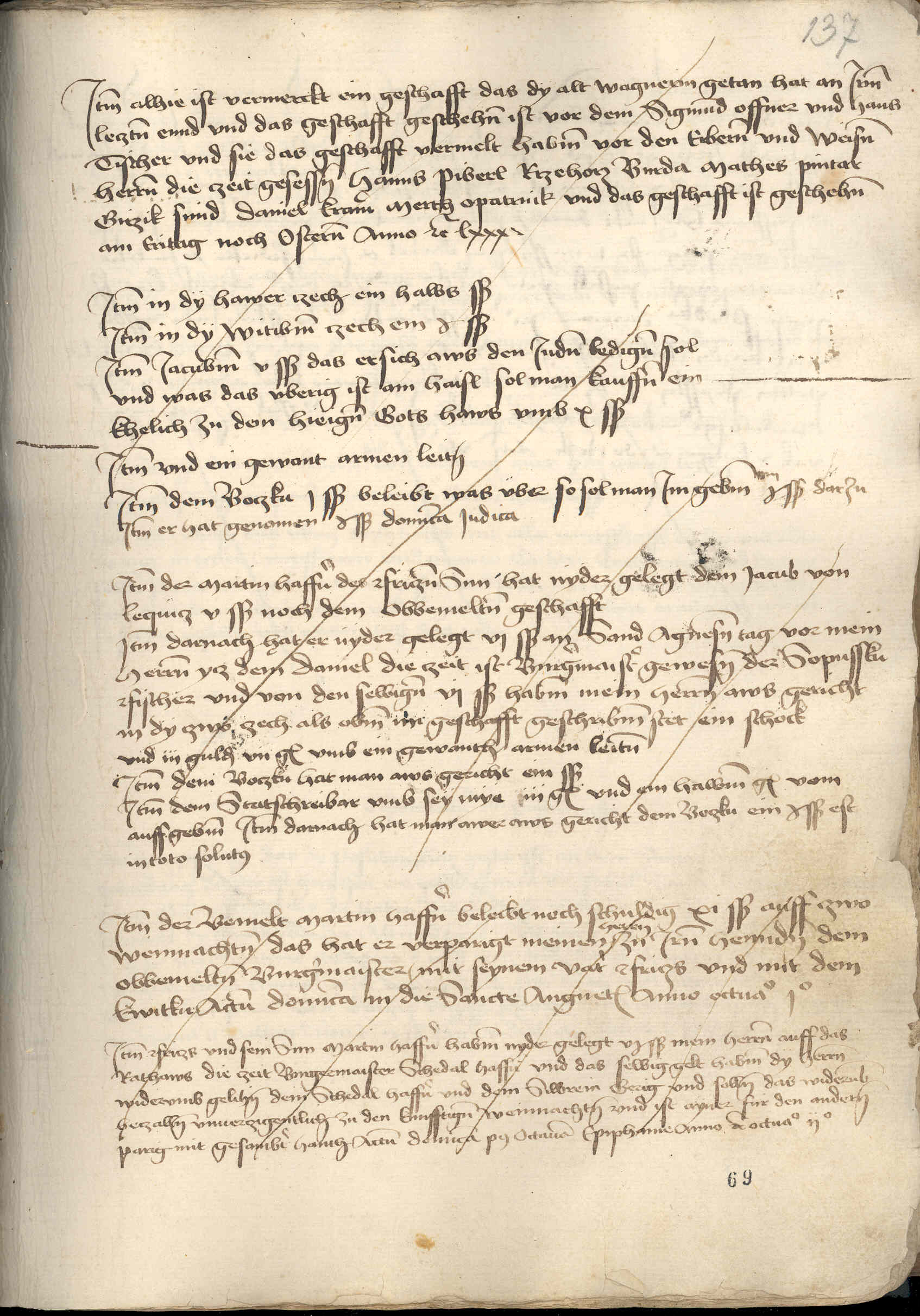 Item alhie ist vermerckt ein geschafft, das dy alt Wagnerin getan hat an irem leczten ennd. Vnd das geschafft geschehen ist vor dem Sigmund offner vnd Hans tischer. Vnd sie das geschafft vermelt habem vor den erberen vnd weisen herren die czeit gesessen Hanus Piberl, Rrzehorz Burda, Mathes pintar, Girzik smid, Daniel kramer, Merth Opatrnik. Vnd das geschafft ist geschehen am eritag noch Osteren anno etc. lxxxi.