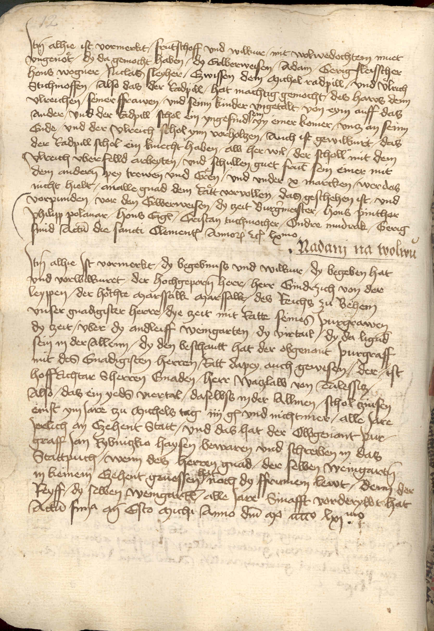 Auch ist gewilkurt / das der Radpill schol ein knecht haben / als her wil / der scholl mit dem Vlreich vber felld arbeyten / vnd schullen guet frunt sein einer mit dem anderen pey trewen vnd eeren / vnd vnder X marcken / wer das nicht hielt / analle gnad2) dem raett vorvollen /. Das geschehen ist / vnd verpunden / vor den erwerweisen / dy czeit burgermeister / Hons pinthar, Philipp Polanar [Polauar?] / Hons Eigel / Cristan tuchmocher / Ondre Mudrak / Gerig smid. Actum die sancti Clementis annorum etc. lxmo.