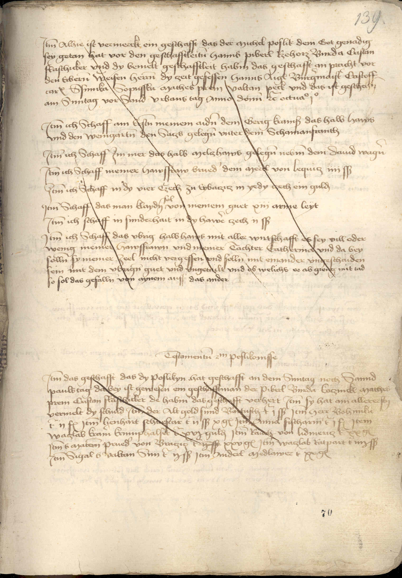 Item ich schaff am ersten meinem aiden dem Gerig Kramser das halb haws vnd den weingarten den Saczs gelegen vnter dem Schamanfranth. Item ich schaff im mer das halb melczhaws gelegen nebem dem David wagner. Item ich schaff meiner hawsfraw brueder dem Mertl von Lequicz [Lechovice] IIII s. Item ich schaff in dy vier czech zu Eybaczicz, in yedy czech ein gulden. Item schaff, das man klayden sol1) von meinem guet XIII arme leyt. Item ich schaff in sunderhait in dy hawer czech II s. Item ich schaff das vbrig halbhaws mit aller wirtschafft, es sey vill oder wenig, meiner hawsfrawn vnd meiner tachter Katherina. Vnd da bey sollen sy meiner zeel nicht vergessen vnd sollen miteinander vngeschaiden sein mit dem vbrigen guet vnd vngetailt. Vnd ob welichs ee2) abgieng mit tad, so sol das gefallen von aynem auff das ander.3)