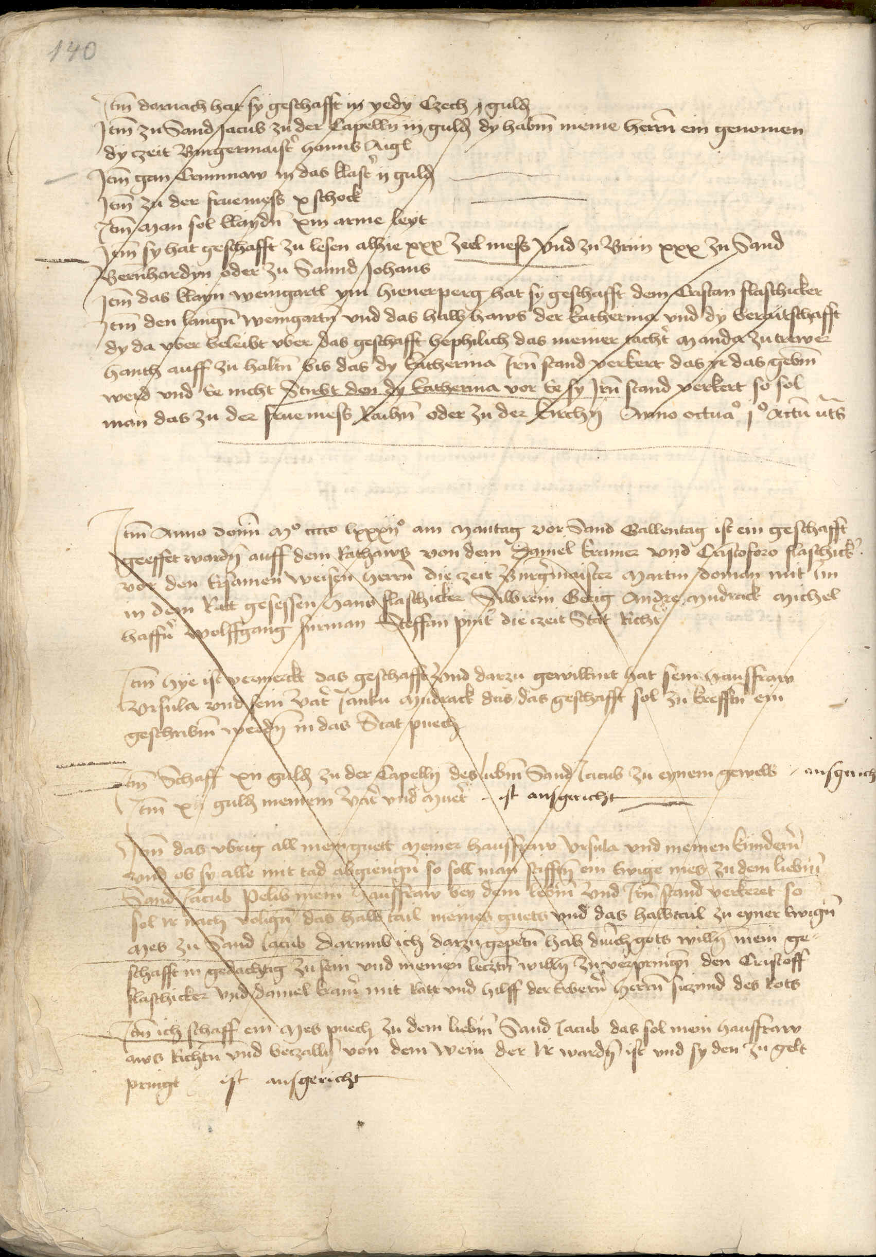 Item hye ist vermerckt das geschafft. Vnd darzu gewilkurt hat sein hausfraw Vrsula vnd sein vater Ianku Mudrack, das das geschafft sol zu krefften eingeschribem werden in das stat puech. Item schaff XII gulden zu der capellen des liebem sand Iacub zu eynem gewelb. Ausgericht.1) Item X gulden meinem vater vnd mueter. Ist ausgericht.2) Item das vbrig all mein guett meiner hausfraw Vrsula vnd meinen kinderen. Vnd ob sy alle mit tad abgiengen, so soll man stifften ein ewige mes zu dem liebem sand Iacub.3) Pelib mein hausfraw bey dem lebem vnd iren stand verkeret, so sol ir nach voligen das halb tail meines guets vnd das halbtail zu eyner ewigen mes zu sand Iacub.4) Darvmb ich darczu gepeten has durich gots willen mein geschafft in gedachtig zu sein vnd meinen leczten willen zu verpringen den Cristoff flaschicker vnd Daniel kramer mit ratt vnd hilff der erberen herren siczund des rots.