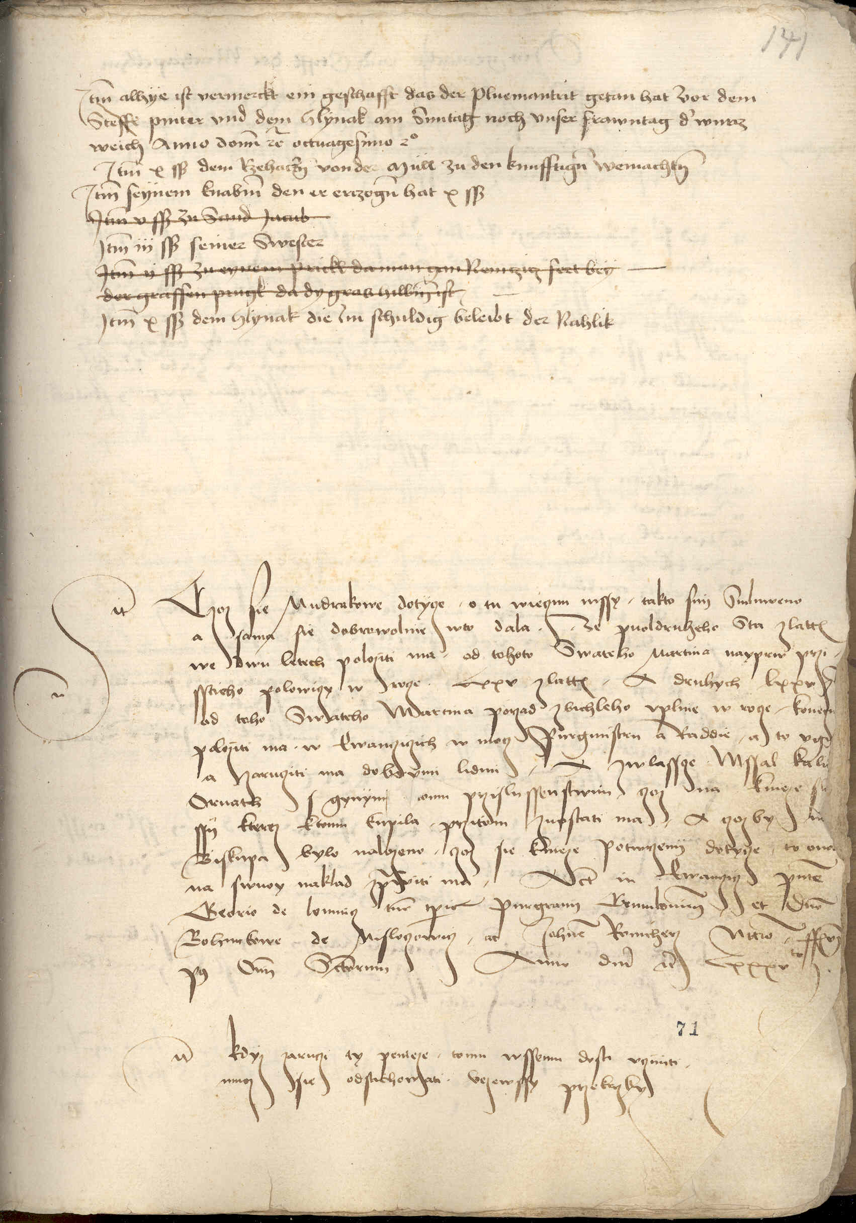 Item czoz sie Mudrakowe dotycze, / o tu wiecznu mssy, / takto s nij smluweno a sama sie dobrowolnie w to dala. Ze puoldruheho sta zlatt. we dwu letech poloziti ma / od tohoto swateho Martina nayprwprzisstieho polowiczy w rocze. LXXV zlatt. / a druhych LXXV zl. od toho swateho Martina porzad zbiehleho vplnie w rocze / konec. poloziti ma w Ewancziczich w mocz purkmistru a raddie, / a to […?] a zarucziti ma dobrymi lidmi, / a zwlasscze mssal, kalich, ornath s gynym tomu przislussenstwim, / czoz na knieze slussij, kterez k tomu kupila, / przi tom zuostati ma. / A czoz by na biskupa bylo nalozeno, / czoz sie knieze potwrzenij dotycze, / to ona na swuoy naklad zprawiti ma. / Actum in Ewanczicz presente Georio de Lomnicz, tunc temporis purgravij Crumloviensis, et domino Bohunkone de Misloczowicz / ac Iohanne Ronicherz – notario, feria via post Omnium sanctorum anno Domini etc. Lxxxvto.