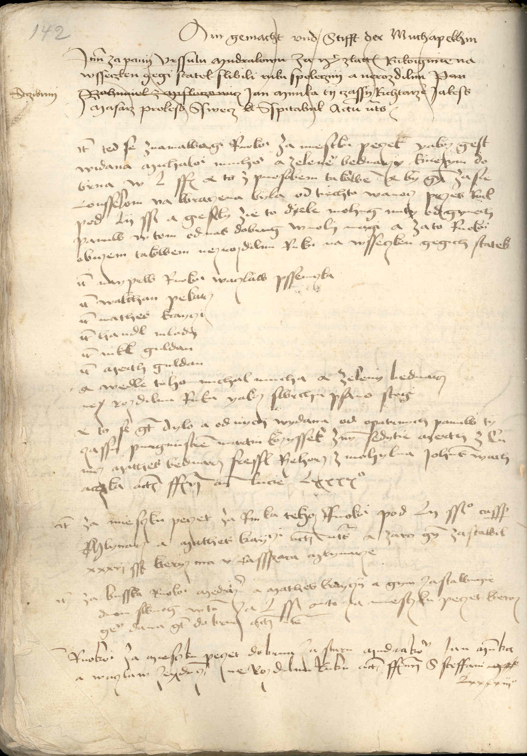 Item nayprw ruokogmi Waczlaw Psseniczka, item Walthan pekarz, item Mathes krayczi, item Handl mladij, item Nikl Guldan, item Merth Guldan. Item wedle toho Michal Mucha a Zeleny bednarz nezrozdilnu ruku, yakoz swrchu psano stogi. A to se gest dylo a od nych wydana od opatrnych panuw, ty czassij purkmistrem Martin Kozyssek, z nym sedytie Merth z Cunicz, Mathes bednarz, Fressl, Rzehorz z Mohylna, Iohanes Wachaczka, actum feria via ante Lucie Lxxxxo.