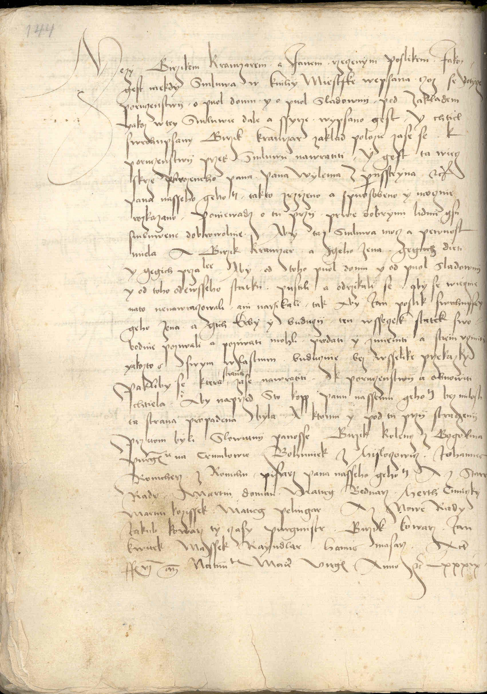Mezy Girzikem Kramzarem a Ianem rzeczenym Poslikem iakoz gest niekdy smluwa w knihy miestske wepsana, czoz se dotycze poruczentwyij o puol domu y o puol sladownij pod zakladem, yakoz w tey smluwie dale a ssyrze wypsano gest. Y chtiel swrchupsany Girzik Kramzar zaklad polozie zase se k poruczenstwij przes smluwv nawratiti. Y gest ta wiecz skrze vrozeneho pana pana Wylema z Pernssteyna etc., pana nasseho Geho Milosti takto zrzizeno a spuosobeno y mocznie rozkazano.