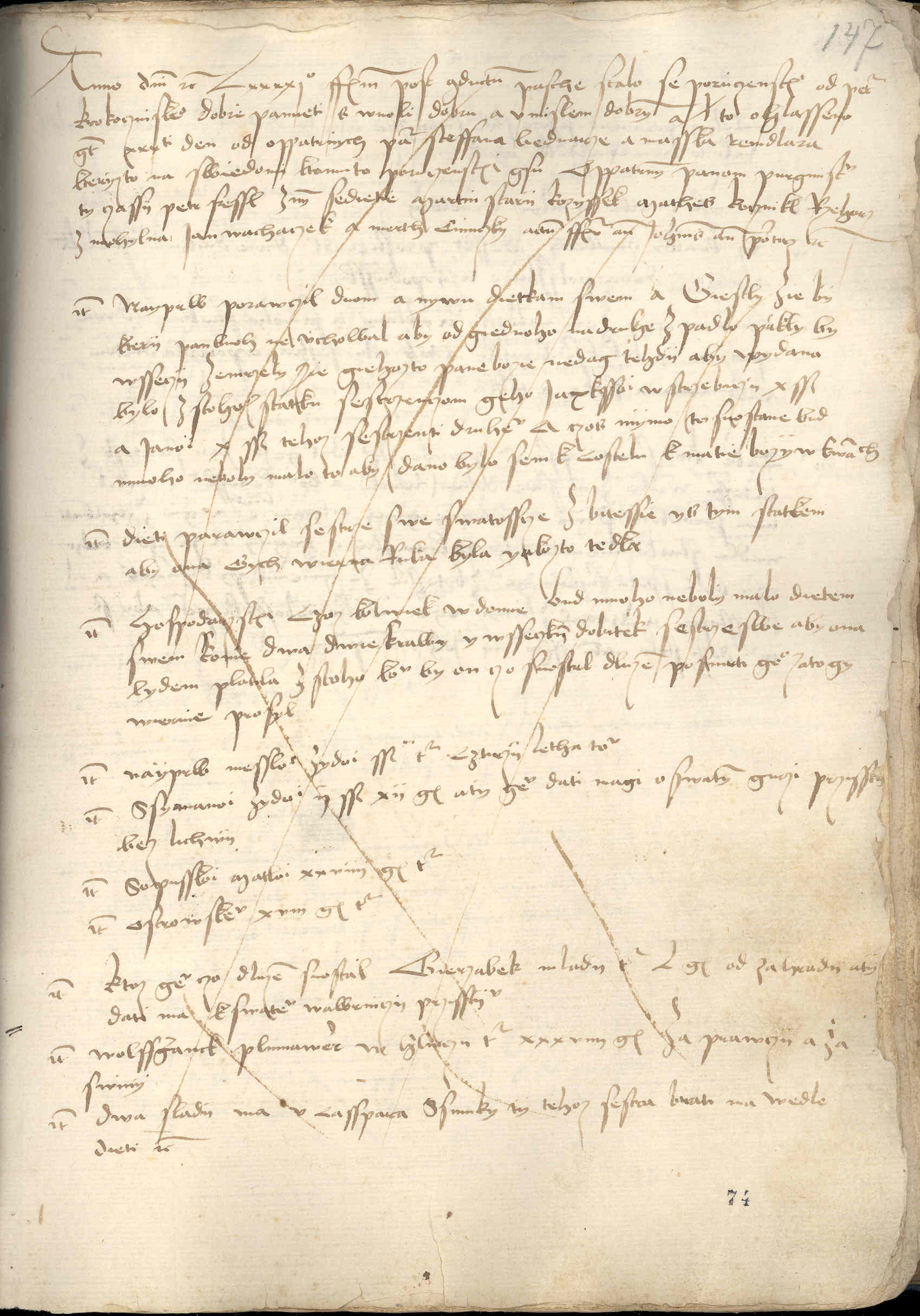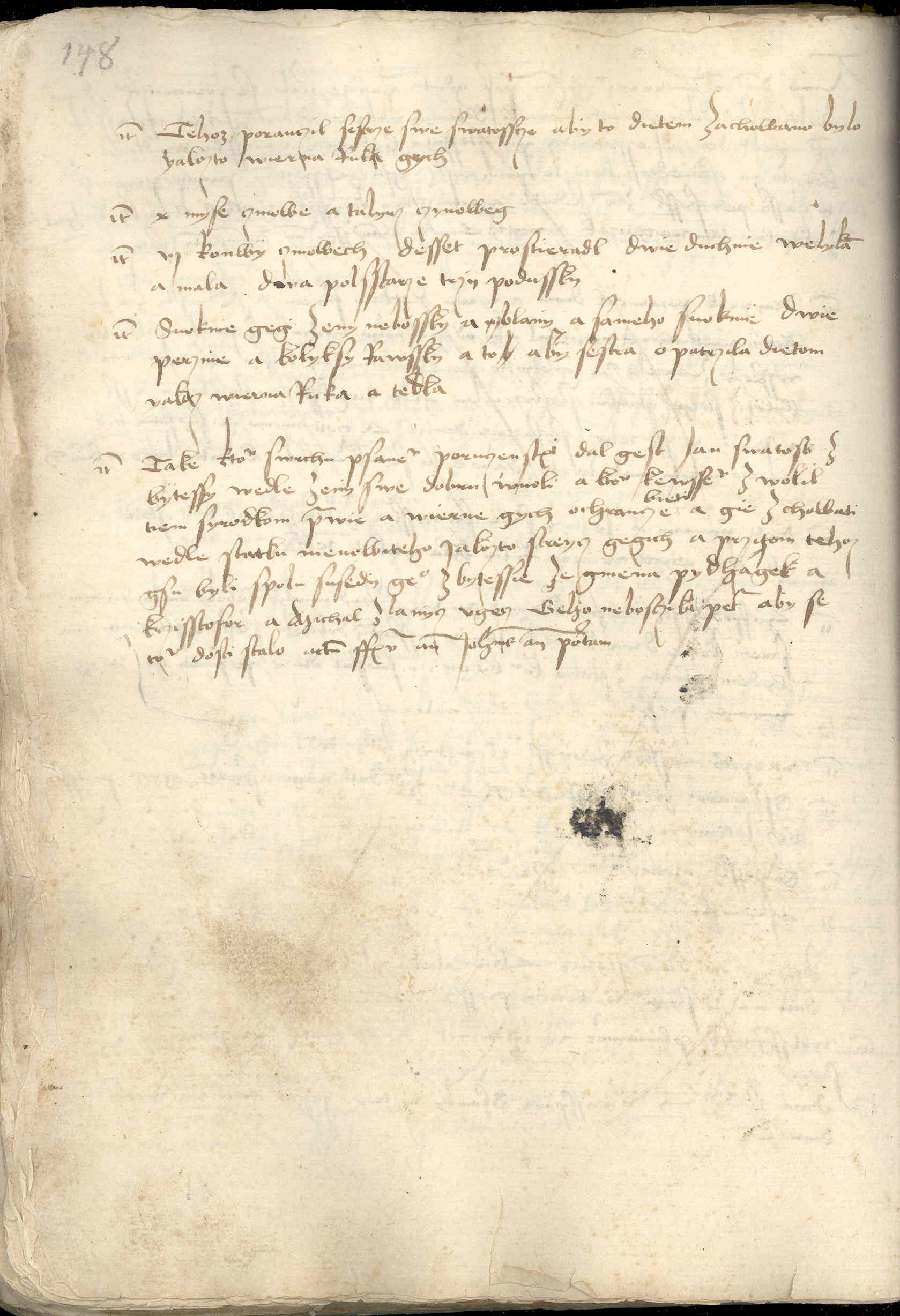 Item nayprw Messlowi zydowi s., tenetur cztirzij letha tomv. Item Ssymanowi zydowi II s. XII gr., a ty gemv dati magi o swatym Girzi przisstij bez lichwij. Item Sopusskowi Matlowi XXVIIII gr. tenetur. Item Ostrowskemv XVIII gr. tenetur. Item ktoz gemv czo dluzen suostal, Gierzabek mladij tenetur L gr. od zahradij, a ty dati ma k swatemv Wawrinczij przisstijmv. Item Wolffganck Plumawer w Hlinczij tenetur XXXVIIII gr., za prawczij a za swiny. Item dwa sladij ma v Casspara Ssumky, ty tehoz sestra brati ma wedle dieti etc. Item tehoz porauczil sestrze swe Swatosscze, aby to dietem zachowano bylo, yakozto wierna ruka gych. Item x myse czinowe a talyrz czynoweg. Item vi konwy czinowech, deset prostieradl, dwie duchnie – welyka a mala, dva polsstarze, trzij podusskij. Item suoknie gegi zeny nebossky a [blany?] a sameho suoknie, dwie perzinie a kolyksy rawssky, a to aby sestra opatrzila dietom yakoz wierna ruka a tedka.