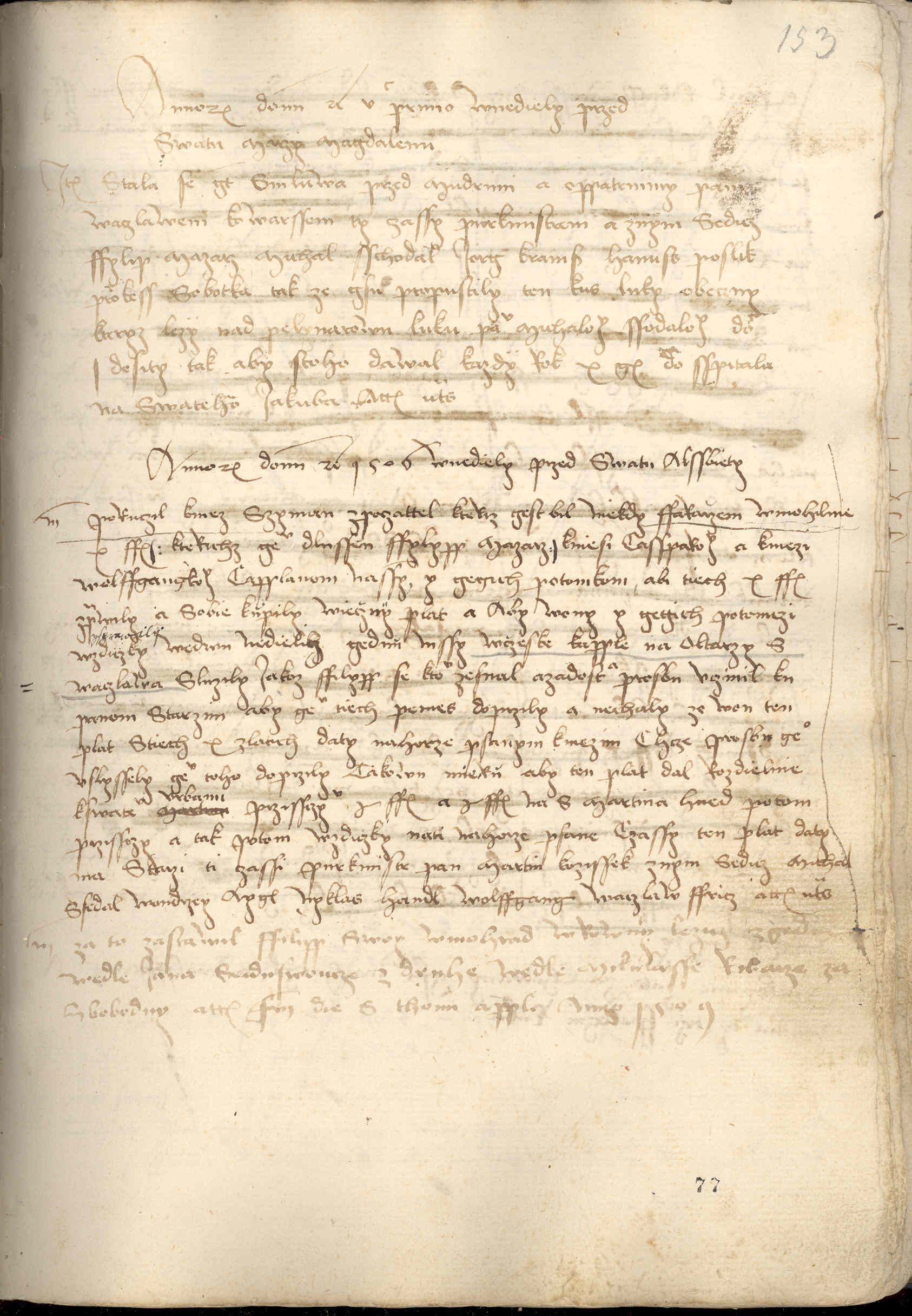 Annorum Domini etc. vc primo w nediely przed swatu Marzy Magdalenu Item stala se gest smluwa przed mudrimi a oppatrnimy pany Waczlawem kowarssem, ty czassy purkmistrem, a z nym sedicz Ffylip mazarz, Michal Sschodal, Iorg Kramsar, Hanuss Poslik, Prokess Sobotka tak, ze gsu propustily ten kus luky obeczny, kteryz lezy nad Pelymarowu luku panv Michalowy Ssodalowy do desity tak, aby s toho dawal kazdy rok X gr. do sspitala na swateho Iakuba, actum ut supra.