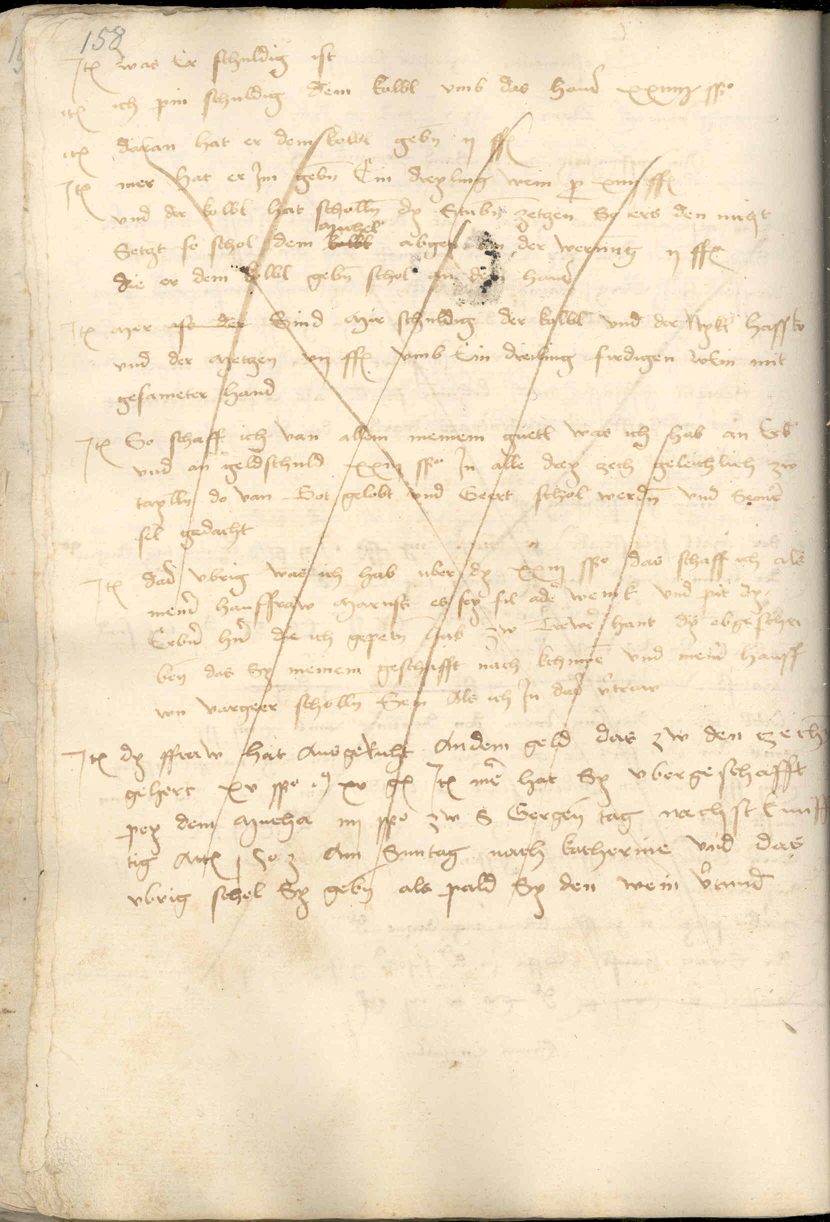Nejprve bylo zaznamenáno, co je mu kdo dlužen. Matl řezník mu dluží tři a půl zlatých bez dvou grošů, k tomu nemá žádného dne. Později připsáno: to dal. Krum Chmel mu dluží tři zlaté, k tomu nemá žádného dne. Později připsáno: dal. Mucha mu dluží za dům dvacet kop grošů a dvacet grošů, den je napsaný v rychtářských registrech. Matouš z Březníku dluží tři zlaté, k tomu nemá žádného dne. Kolbl dluží dva drajlinky vína, jeden drajlink za čtrnáct zlatých. Za jeden má dát na svatého Jiří příští čtrnáct zlatých a další má na domě, který on koupil, také drajlink za čtrnáct zlatých. Později připsáno: dal čtrnáct zlatých. Jiří provazník v Rybářské ulici dluží tři kopy grošů za zahradu, a to na tři Vánoce. Marek Pleyer dluží půl kopy grošů, k tomu nemá žádný den. Později připsáno: dal. Švarc Štefl v Rybářské ulici dluží dvě kopy grošů, k tomu nemá žádného dne. Finstrle dluží osmnáct grošů, dal patnáct grošů, dluží ještě tři groše.