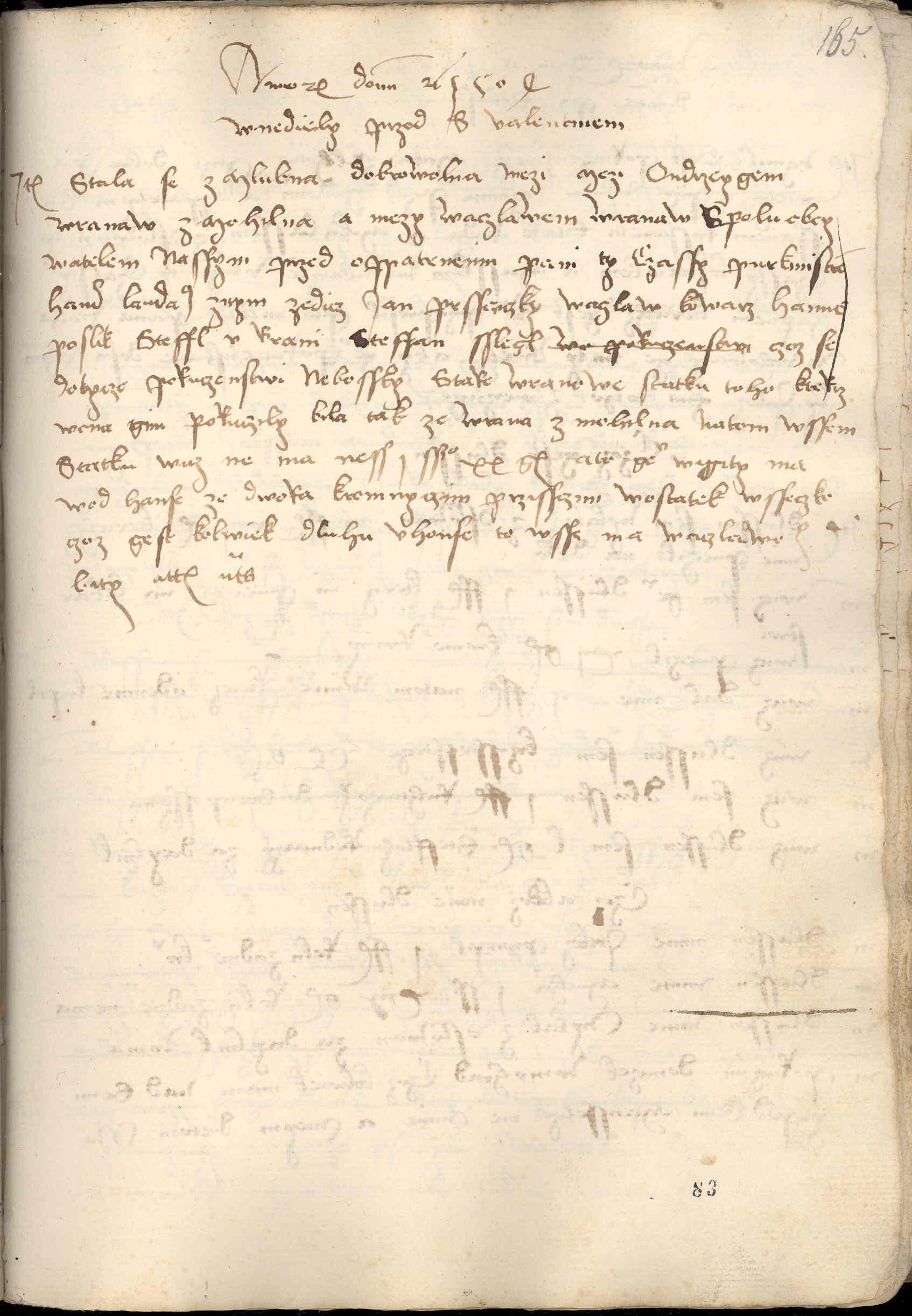 Annorum Domini etc. 1504 w nediely przed s. Valencinem Item stala se zmlubna dobrowolna mezi mezi Ondrzeygem Wranaw z Mohilna a mezy Waczlawem Wranaw, spoluobeywatelem nassym, przed oppatrneimi pani, ty czassy purkmistrem Hans Laudamus, z nym zedicz Ian Prsscziczky, Waczlaw kowarz, Hanns Poslik, Steffl v Brani, Steffan Sslegl. wo poruczenstwi1) Czoz se dotycze poruczenstwi nebossky stare Wranowe statku toho, kteriz wona gim poruczily, bila tak, ze Wrana z Mohilna na tom wssem statku wicz nema ness I s. XX gr., a to gemv wygity ma wod Hanse ze Dwora kromnyczim przissczim, wostatek wsseczko czoz gest kolwiek dluhu v Honse, to wsse ma Waczlawowy bity, actum ut supra.