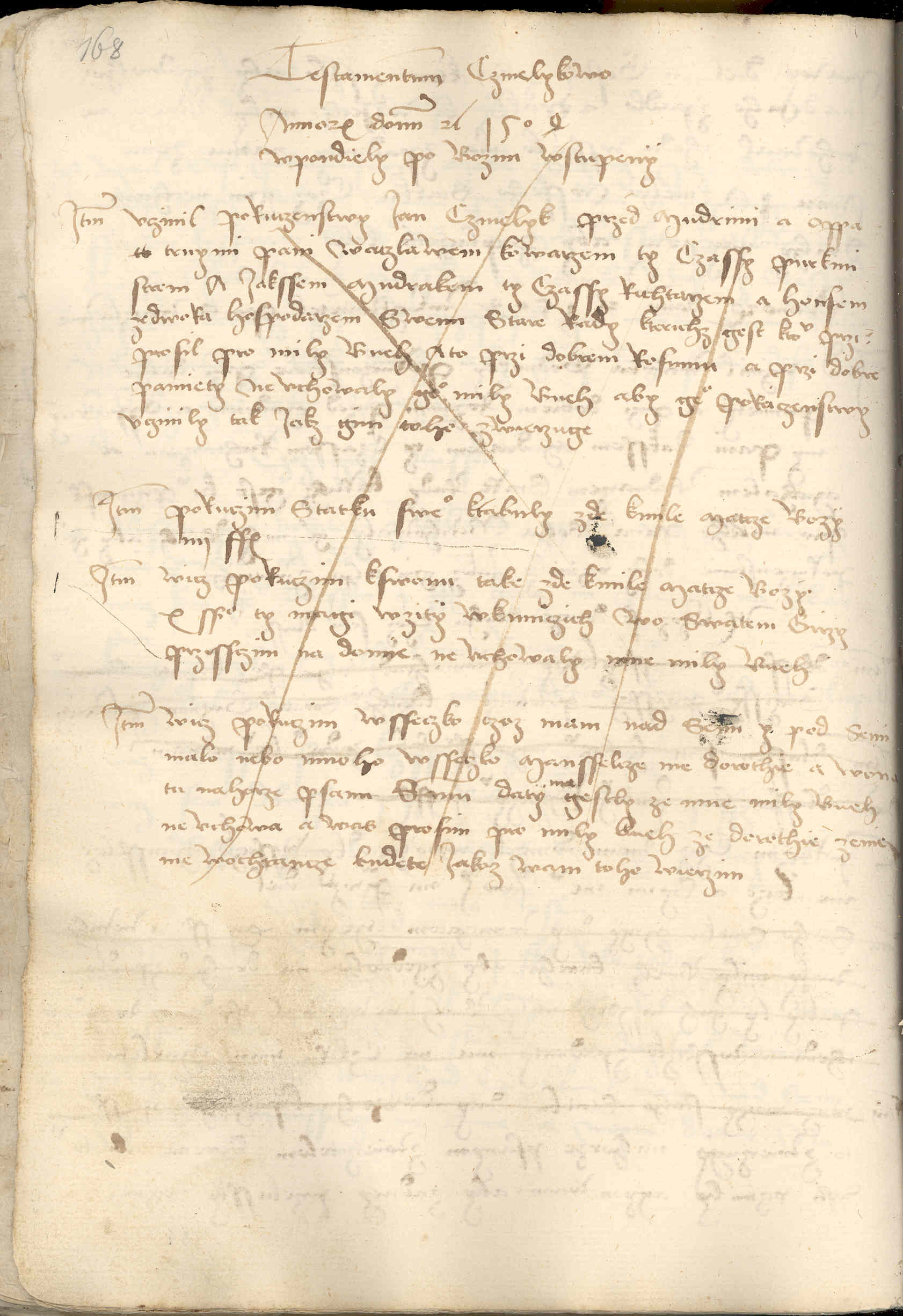 Annorum Domini etc. 1504 w pondiely po bozim Wstupeny Item vczinil poruczenstwy Ian Czmelyk przed mudrimi a oppatrnymi pani Waczlawem kowarzem, ty czassy purkmistrem, a Iakssem Mudrakem, ty czassy richtarzem, a Honsem ze Dwora, hospodarzem sweim, stare rady, kterichz gest k tomv prziprosil pro mily Bueh, a to przi dobrem rosumu a przi dobre pamiety. Nevchowaly geho mily Bueh, aby geho poruczenstwy vczinily, tak iakz gim toho zwierzuge.