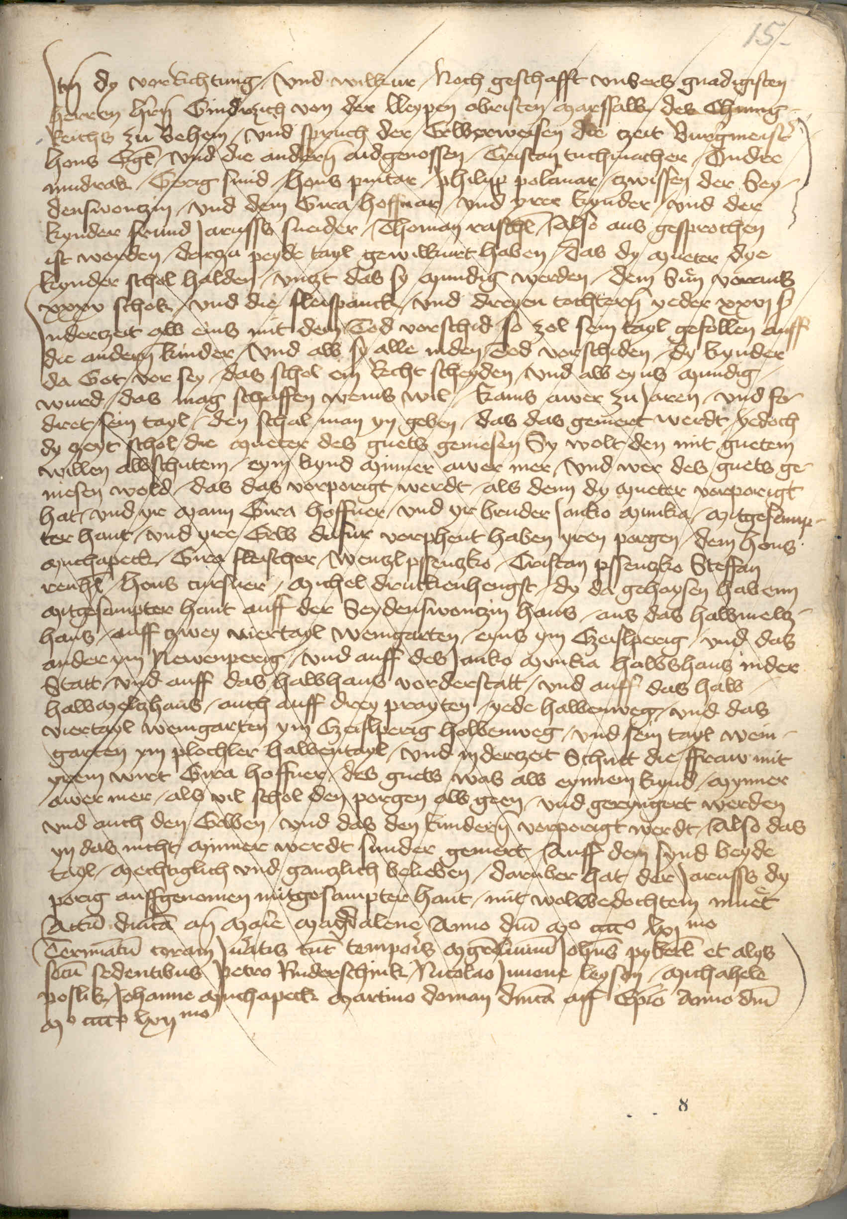 Also aus gesprochen ist worden / darczu peyde tayl gewilkurt haben / das dy mueter dye kynder schol halden / vnczt das sy mundig werden / dem suen voraus XXXV schok vnd die fleispanck / vnd dreyen tochteren yeder XXXVI s. in der czeit, als eins mit dem tod vorschid, so zol sein tayl gefollen auff die anderen kinder / vnd als sy alle in den tod vorschiden / dy kynder, da Got vor sey / das schol ain recht scheyden /. Vnd als eyns mundig wurd / das mag schaffen wems wil / kams awer zu iaren / vnd fodret sein tayl / den schal man yn geben / das das gemert werdt / yedoch dy czeyt schol die mueter des guets geniesen, sy wolt den mit guetem willen awschuten1) / eyn kynd minner awer mer / vnd wer des guets geniesen wold / das das vorporigt werdt / als denn dy mueter vorporigt hat / vnd yr mann Gira hoffner / vnd yr bruder Ianko Munka / mitgesampter hant / vnd yre erw dafur vorphent haben yren porgen / dem Hons Muchapeck / Gira fleischer / Wenczl Pssenczko / Cristan Pssenczko, Steffan Reuhel / Hons cursner / Michel Druckenhengst / dy da gehaysen haben mitgesampter hant auff der Seydenswonczin haus / aus das halbmelczhaus / auff czwey viertayl weingarten / eyns ym Czeislperig [Syslice] / vnd das ander ym Newenperig / vnd auff des Ianko Munka hawshaus2) in der statt / vnd auff das hawhaus vor der statt / vnd auff das haw, haw melczhaus / auch auff drey prayten / yede hawenweg / vnd das viertayl weingarten ym Czeislperig [Syslí hora] hawenweg / vnd sein tayl weingarten ym plochler hawentayl / vnd in der czeit schutt3) die ffraw mit yrem wirt Gira hoffner / des guets was aw4) eynnen kynd / mynner awer mer / als vil schol den porgen awgeen5) / vnd geryngert werden vnd auch den erwen / vnd das den kinderen vorporigt werdt /.