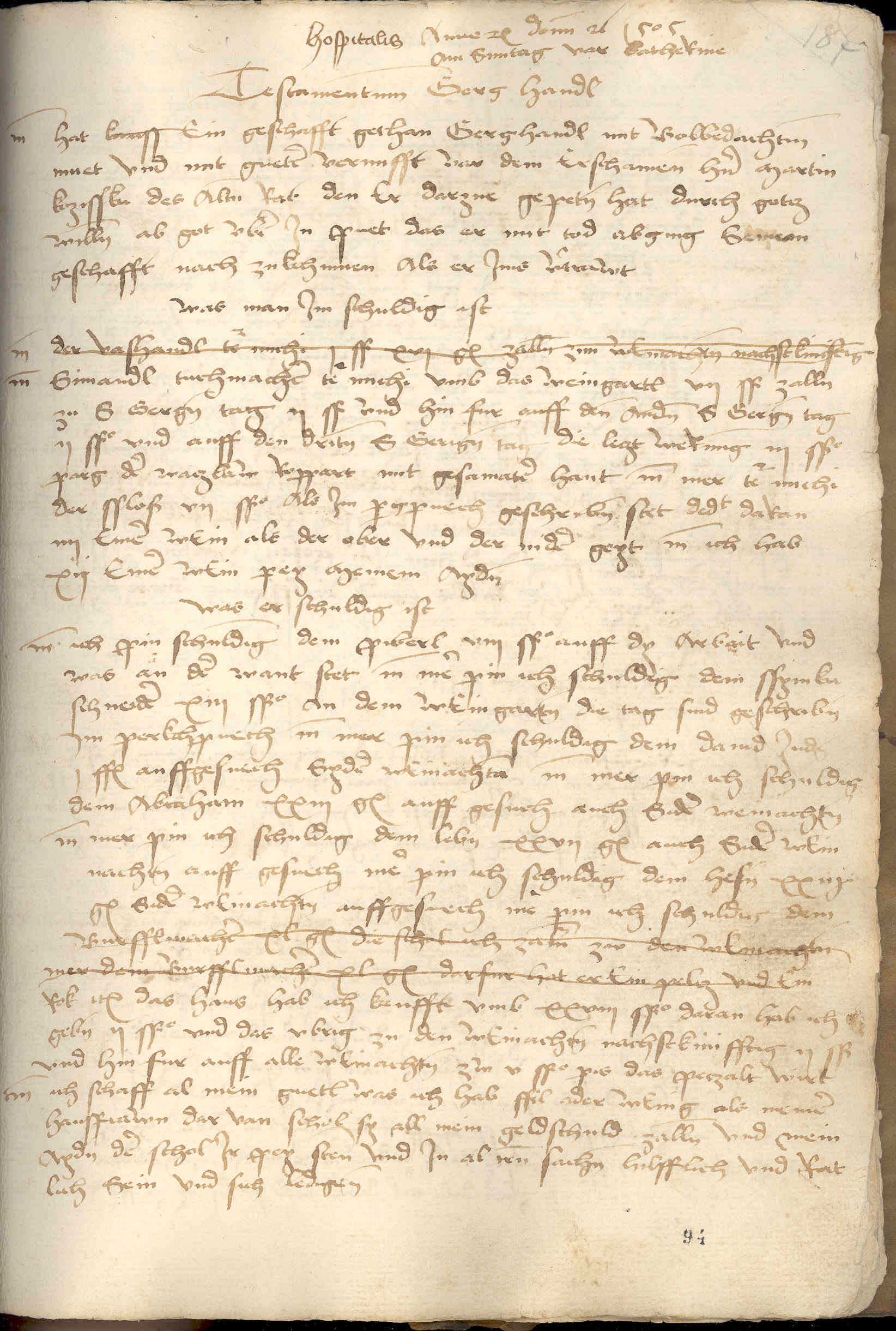 Annorum Domini etc. 1505 am suntag var Katherine Testamentum Gerg Handl Item hat […?] ein geschafft gethan Gerg Handl mit bolbedachtem muet vnd mit gueter vernufft var dem erschamen herren Martin Kozissku, des alten rat, den er darzue gepeten hat durch gotcz willen, ab got vber in puet, das er mit tod abging, seinen geschafft nach zu kchumen, als er ins vertrawt.