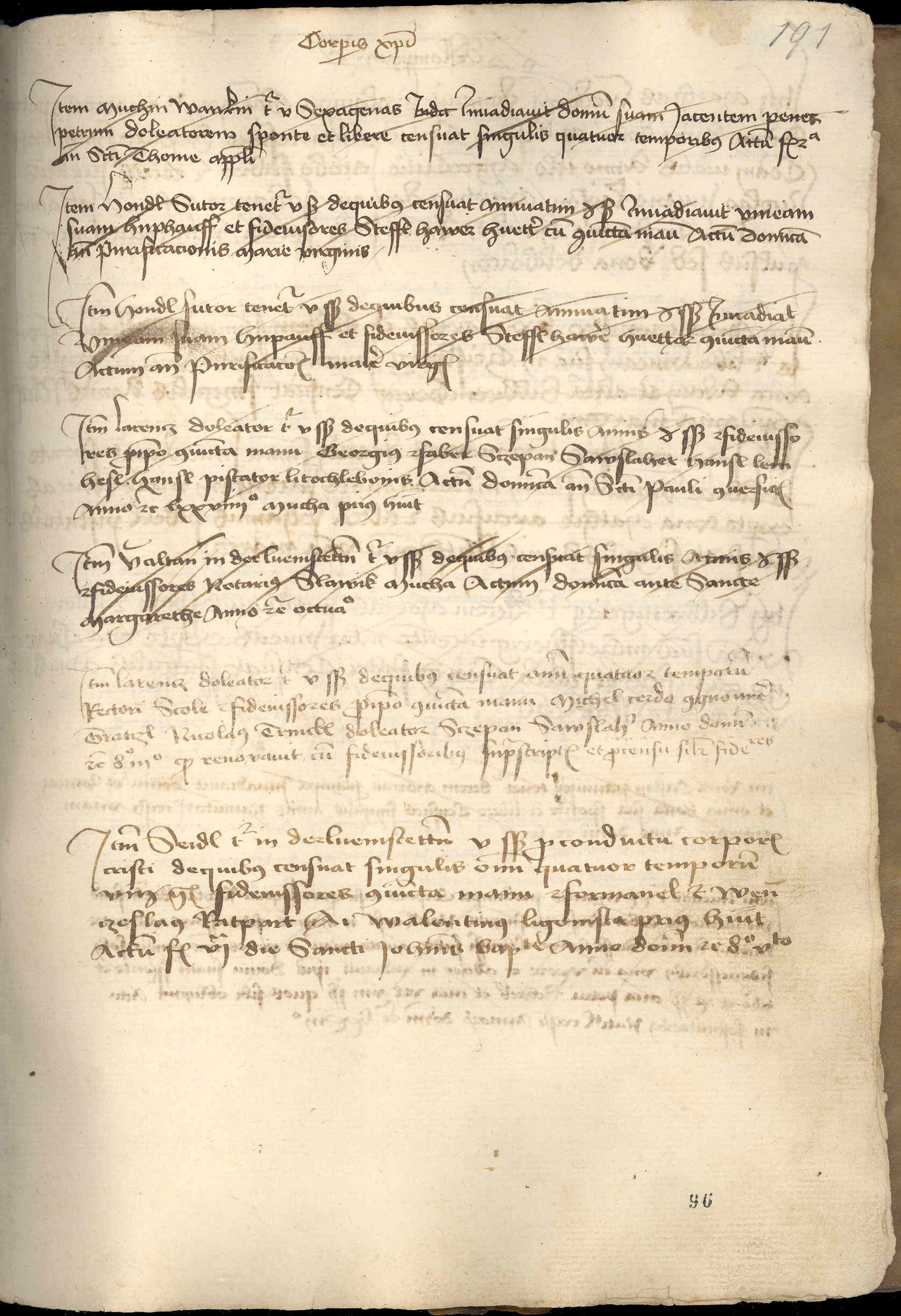 Item Larencz doleator tenetur V sex., de quibus censuat omnium quatuor temporum rectori scole. Fideiussores pro ipso coniuncta manu Michel cerdo congnomine Gratczl, Nicolaus Trinckl doleator, Sczepan Sawslaher. Anno Domini etc. 8o iiio, quod renovavit cum fideiussoribus suprascriptis et pro censu similiter fideiussores.11)