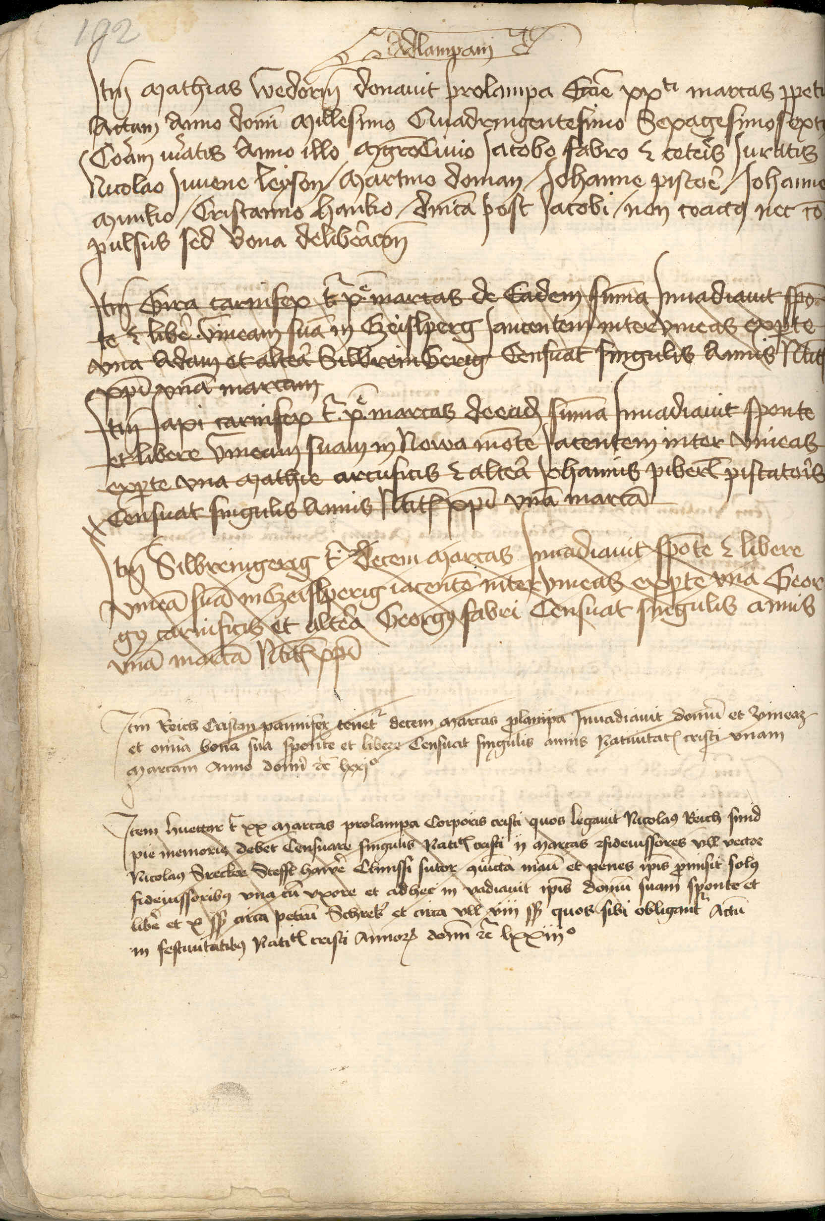 Item Reich Cristan pannifex tenetur decem marcas pro lampa. Invadiavit domum et vineam et omnia bona sua sponte et libere, censuat singulis annis Nativitatis Cristi unam marcam, anno Domini etc. lxxjo.8)9)