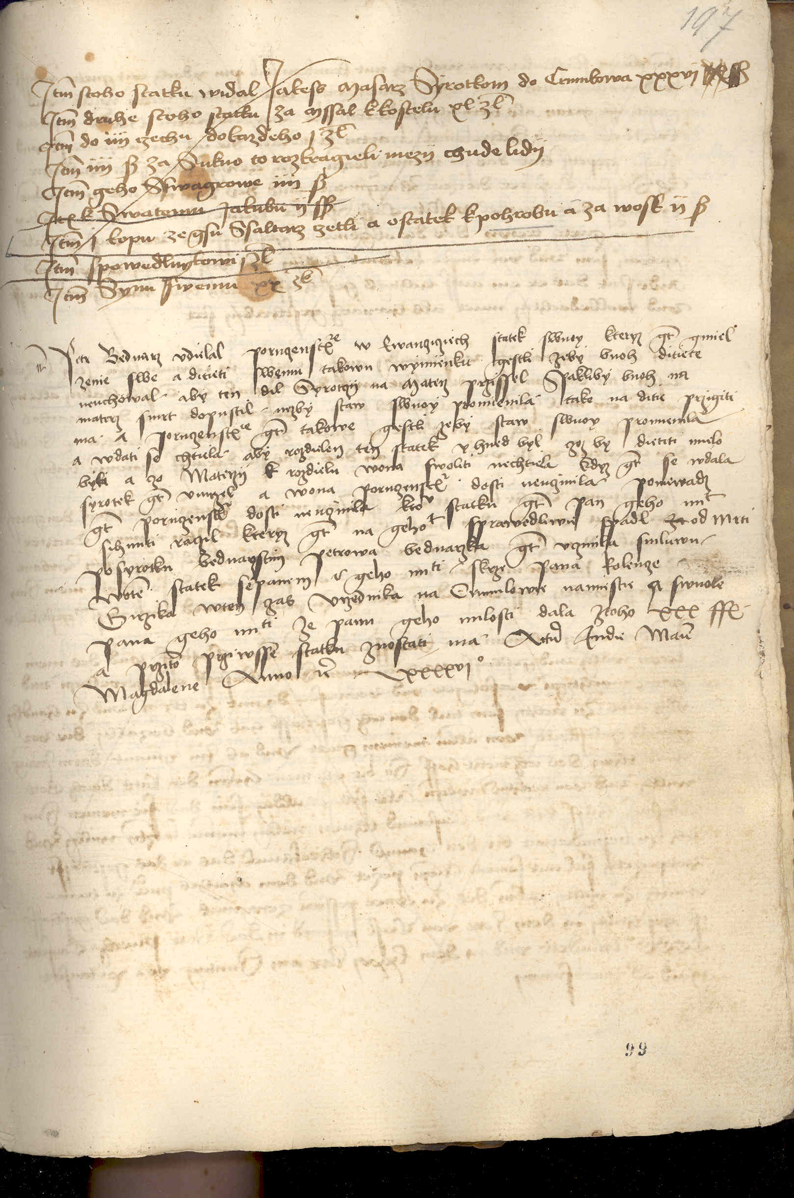 Petrowa bednarzka gest vczinila smluwu / wo ten stateke se panem s Geho Milosti / skrze pana Kolencze Girzika, w ten czas vrzednika na Clumlowie na miestie, a s wuole pana Geho Milosti, ze panu Geho Milosti dala z toho XXX fl., a przi tom przi wssem statku zuostati ma, / actum in die Marie Magdalene anno etc. lxxxxvio.